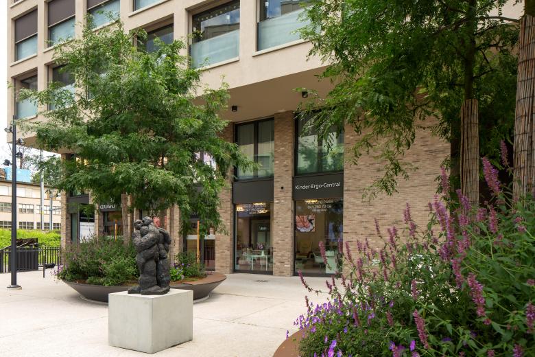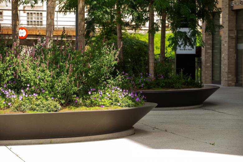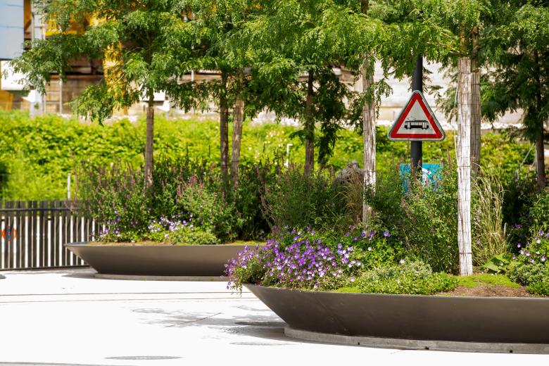 Sie sind kleine Inseln inmitten des Stroms von geschäftigem Treiben und Verkehr: Drei grosse, ovale Pflanzschalen setzen einen akzentuierten Kontrapunkt zur urbanen Umgebung des Centralplatzes. Ein heller Betonbelag markiert die gebäudenahen Aufenthaltsbereiche rund um die Schalen. Von niedrigen Bodendeckern wie der immergrünen Schleifenblume über prächtig bunte Tulpen, Lilien, Narzissen und anderen Frühlingsblühern bis zu hochstämmigen Gleditschien lässt die pflegeleichte und abwechslungsreiche Bepflanzung den Wandel der Jahreszeiten ablesen. Die Pflanztröge als repräsentative räumliche Elemente bestehen aus korrosionsgeschütztem, dezent in Grau gestrichenem Stahl und bilden eine Metapher zur Stahlproduktion in Emmenbrücke. Sie laden dank ihrer breiten Sitzauflage an den Rändern zum gemütlichen Verweilen ein.
