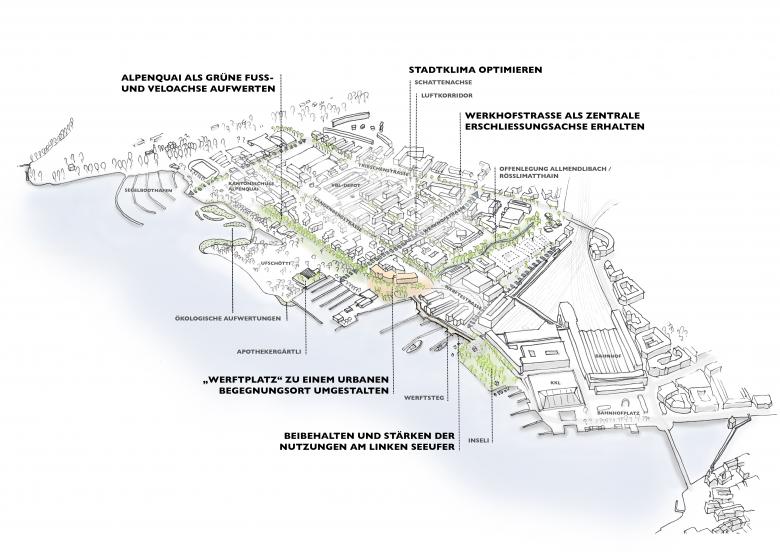 Das linke Seeufer ist ein bedeutendes Naherholungsgebiet der Stadt Luzern. Es vereint sowohl intensiv genutzte wie auch naturnahe Bereiche. Das «Entwicklungskonzept linkes Seeufer» weist den Weg hin zu einem urbanen Lebensraum. Mit viel Grün wird das Gebiet attraktiviert und stadtklimatische Massnahmen sorgen für gute Durchlüftung und Abkühlung.