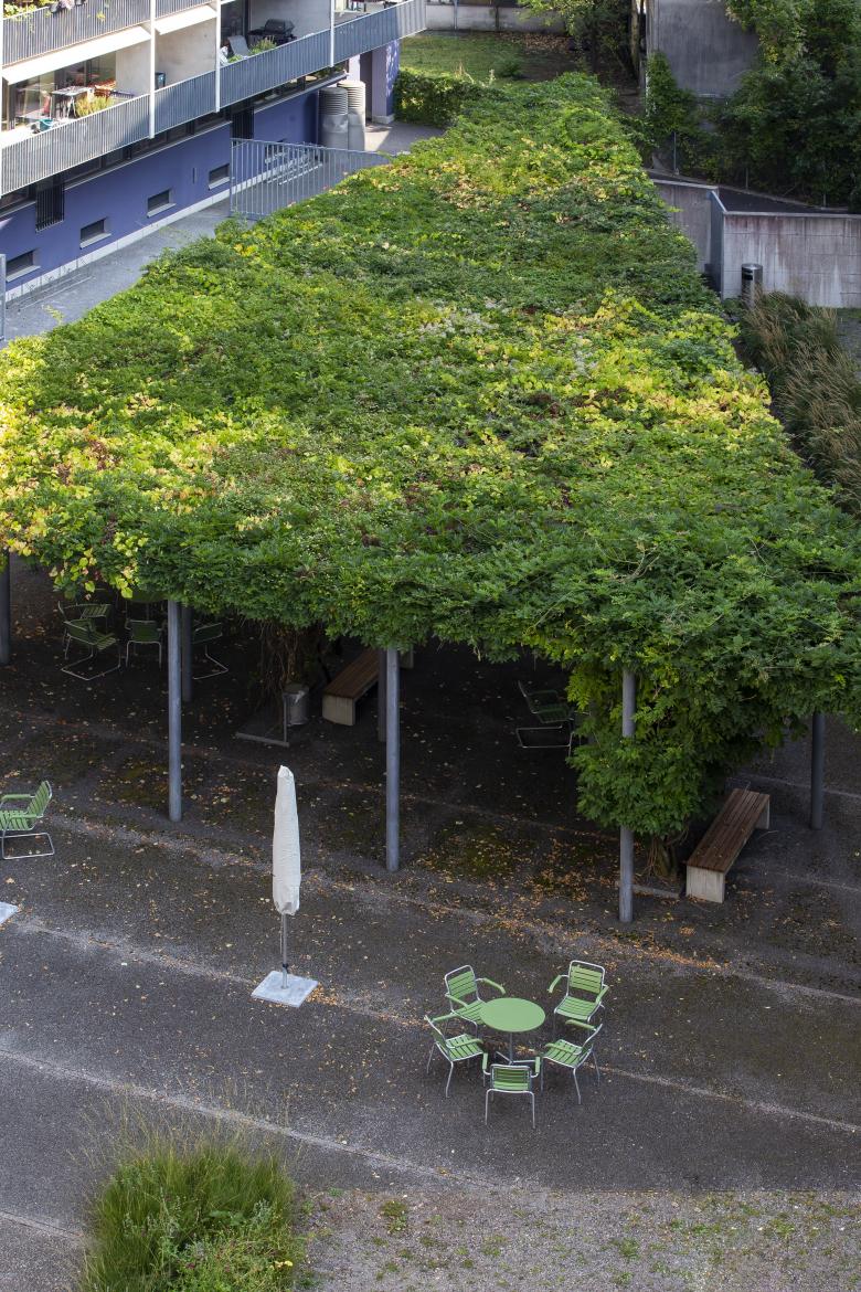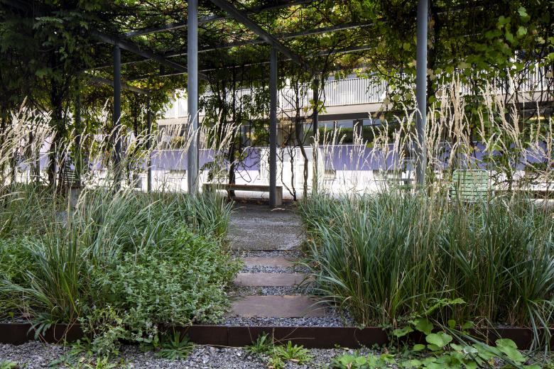 Mit dem Blick aus dem Fenster auf das Muster aus Seerosen, Belagsflächen, Grasstreifen und Gründach ist der Dialog von Künstlichkeit und Natur je nach Licht und Jahreszeit täglich neu zu entdecken. Erleben lässt er sich auf einer Ruhebank im Schatten des Blätterdaches, beim Spazieren den Gräsern entlang bis zum Seerosenbecken oder bei einer entspannten Partie Pétanque auf den Kiesflächen.