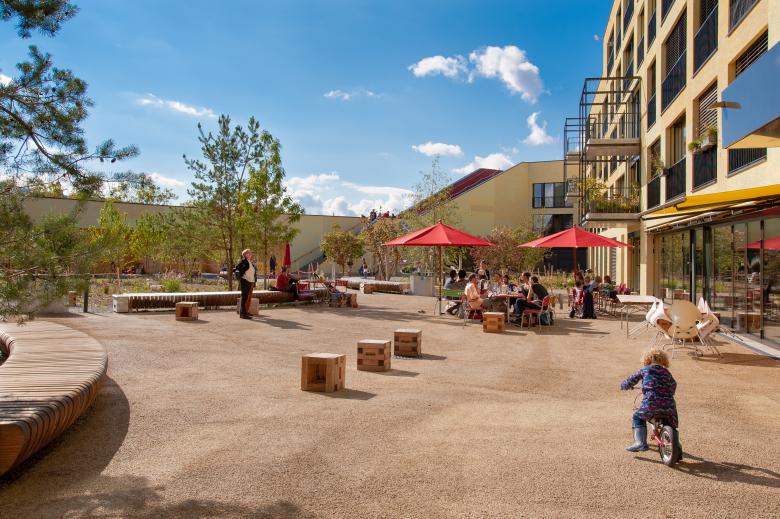 Der Wohn- und Gewerbebau Kalkbreite in Zürich bildet eine Hülle um das bestehende Tramdepot, das weiterhin in Betrieb ist. Das Freiraumkonzept wurde im Rahmen eines partizipativen Workshops zusammen mit der Genossenschaft Kalkbreite entwickelt. So laden nun offene, vielfältig nutzbare Flächen mit Spielplatz, Rutsche und lange Sitzbänke aus natürlichen Materialien und einem Teich zu gemeinsamen Aktivitäten, die teilweise von den Bewohnervereinen organisiert und mitgestaltet werden. Der mit Stauden, Sträuchern, Wiesenblumen und Bäumen bepflanzte Innenhof ist sozusagen das grüne «Wohnzimmer» des Quartiers, in dem die Bewohnerinnen und Bewohner das soziale Leben pflegen. Der umliegende Strassenraum bietet – gestalterisch mit dem Gebäude korrespondierend – Platz für Aussengastronomie sowie weitere Aufenthaltsmöglichkeiten.
