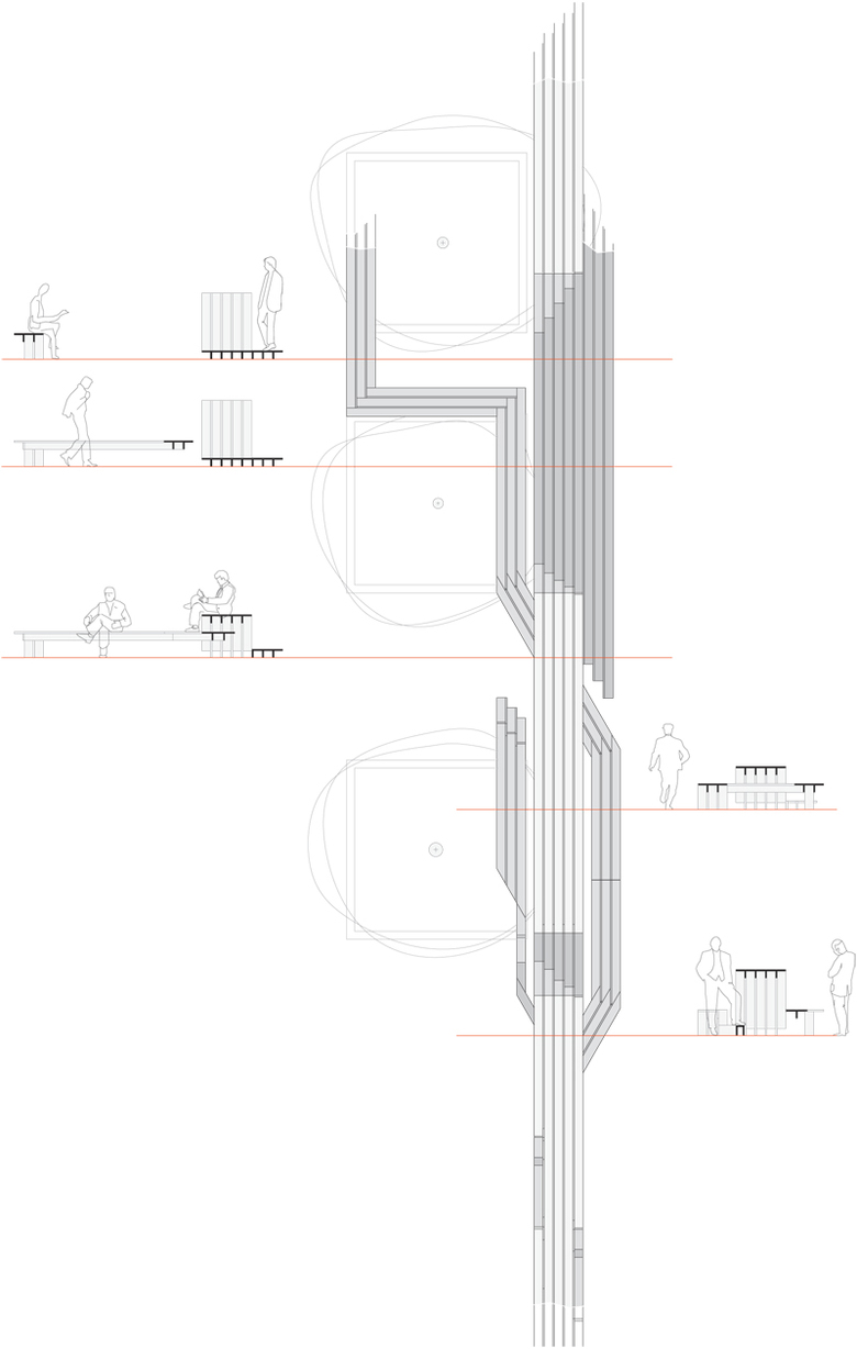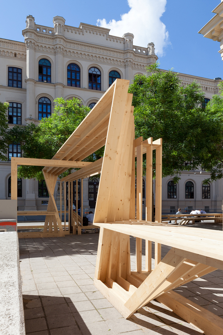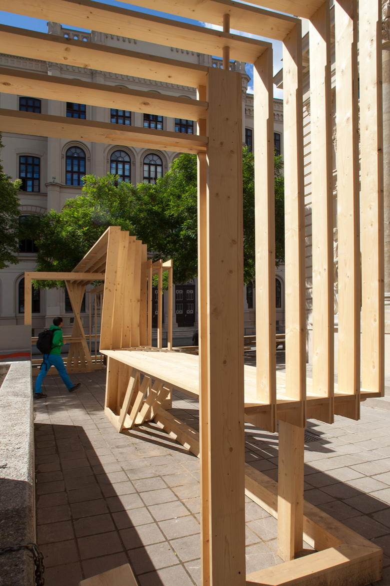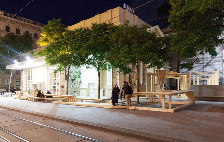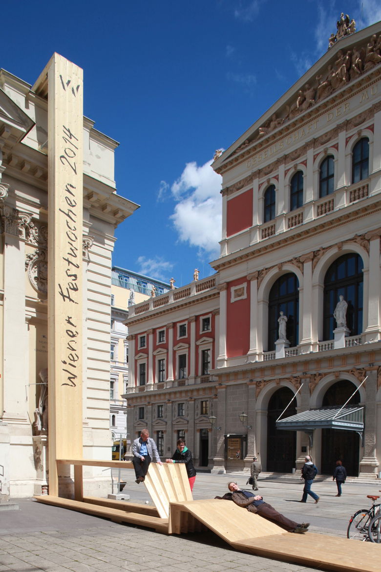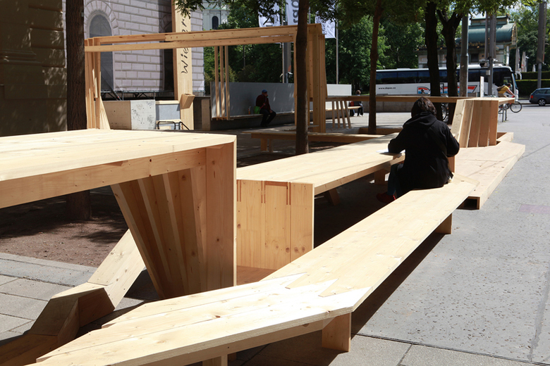 Die Skulptur wandert hinunter in die Passagengalerie im Künstlerhaus, sie springt über das Künstlerhaus, verbindet den Stadtkino-Trakt mit dem brut. Die Orte, die dabei entstehen, samt ihrer „Benutzbarkeit“, entspringen einem Bekenntnis zur Konsumfreiheit im urbanen Freiraum der Stadt, zu bewusst markierten Plätzen urbanen Aufenthalts.Im konkreten Fall geht es auch um ein Nebeneinander mit dem Schanigarten unter jener Esche, die jahrelang durch ein Werbeplakatgerüst verdeckt war. Die Skulptur ist somit auch Beginn einer Aktivierung eines allzu lang durch fassadenhohe Werbung dominierten Raums. Am Ende der Wiener Festwochen wird die Skulptur abgebaut und in einzelnen Brettern bis zum nächsten Jahr gelagert, um dann wieder aufzutauchen – in veränderter Form, die dann wiederum sich selbst und den Leuten Raum schafft.