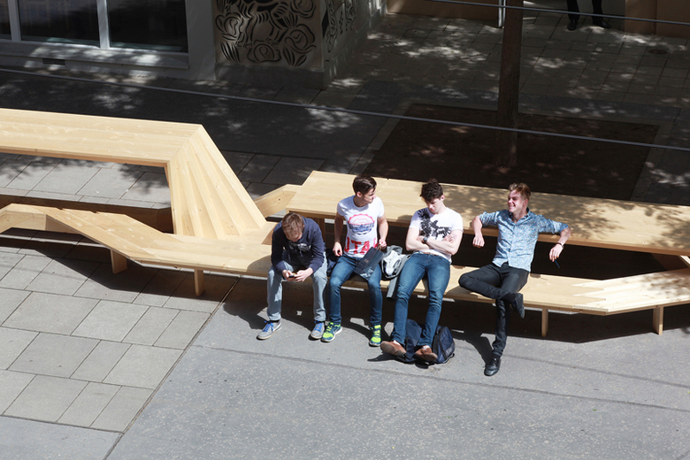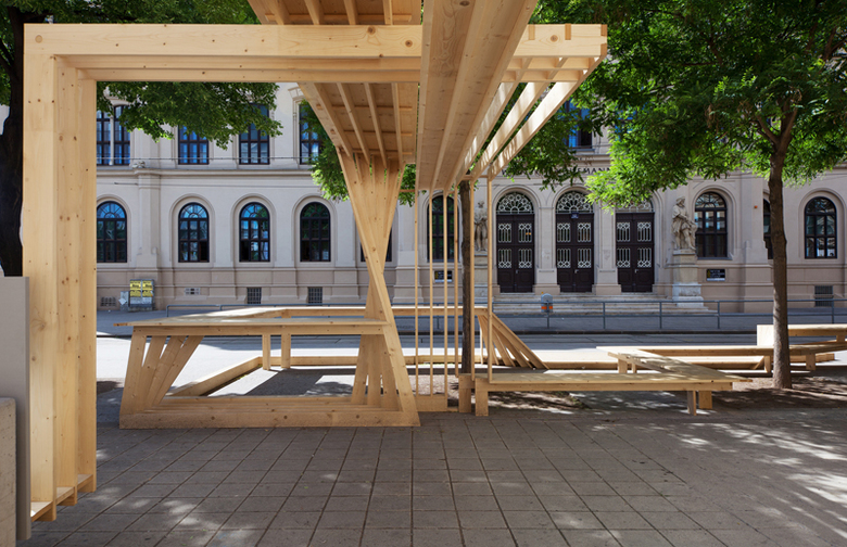 Für die Dauer der Festwochen entsteht rund um das Festwochen-Zentrum im Künstlerhaus eine temporäre Skulptur, die dessen Außenraum als Handlungs- und betont öffentlichen Raum markiert. Als Versammlungsort wächst geradlinig vom Eingang des Festwochen-Zentrums aus eine Art „Unrunder Tisch“ aus einfachen, immer gleichen Holzbrettern – neue, aber auch Recycling-Bretter. Nicht verleimt, sondern durch intelligente Holzverbindungen zusammengehalten, wuchert die Fichtenbretterlandschaft ins Entformte und Wandelbare aus und bildet dabei eine Abfolge von Raumkonstellationen: Stehtisch wird Sitzbank, Liegefläche, wird Pergola, Wand und Zeichen – für Kunst- und Kulturinteressierte, KinobesucherInnen, StadtbewohnerInnen, Schüler und Schülerinnen der benachbarten Schule.
