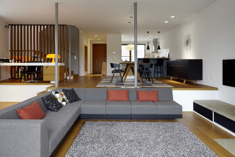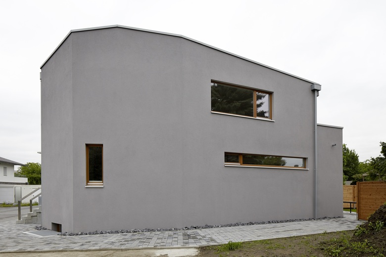 Zwei rechteckige Volumina im 90°-Winkel zueinander versetzt definieren Vorfahrt und Garten bzw. überdachen Hauseingang und Freisitz. Das Gebäude stellt durch seine Kubatur eine enge Verbindung zwischen Außen- und Innenraum her.