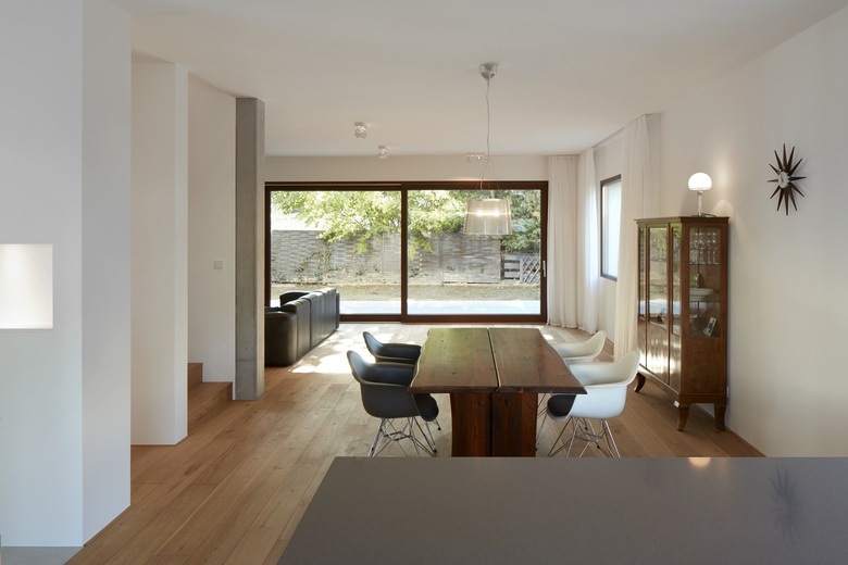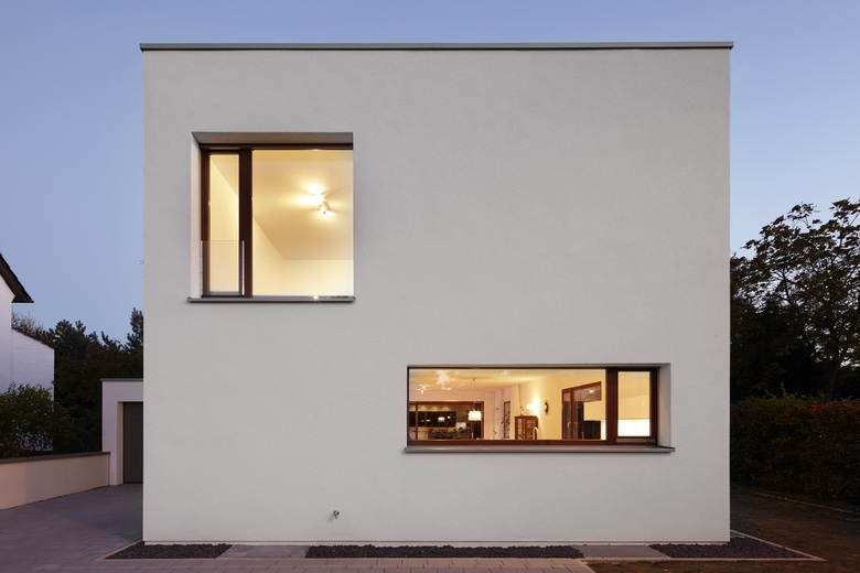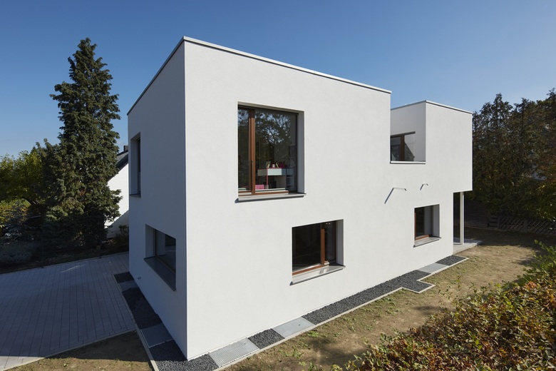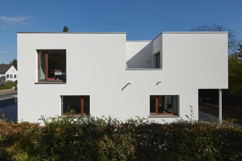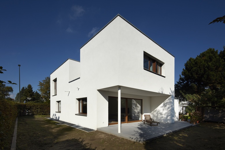 Die voluminösen Ein- und Ausbuchtungen eines zweigeschossigen Kubus gestalten den Hauseingang, die Loggia und den Freisitz. Ein offenes Erdgeschoss in Form eines Einraumes und ein klassisches Obergeschoß mit Schlaf- und Badezimmern plus kleinem Büro bieten Raum für eine vierköpfige Familie. Das Haus wird monolithisch und mit regenerativer Haustechnik erstellt.