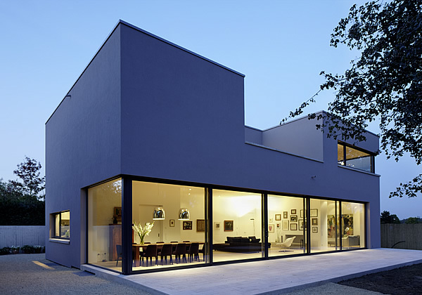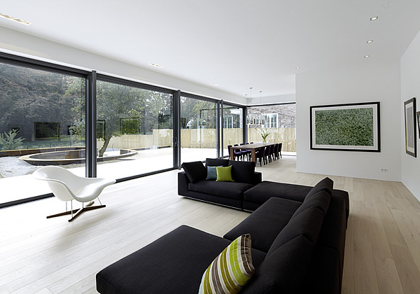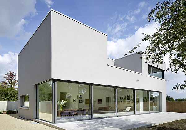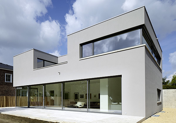 Das einfache, rechtwinkelige Gebäudevolumen des Einfamilienhauses verschließt sich gegen den öffentlichen Raum und öffnet sich vollständig zum Garten hin. Der Wohn-und Essbereich im Erdgeschoss verläuft fließend und der Schlafbereich im Dach gliedert sich separiert und generiert ein hohes Maß an Intimität.