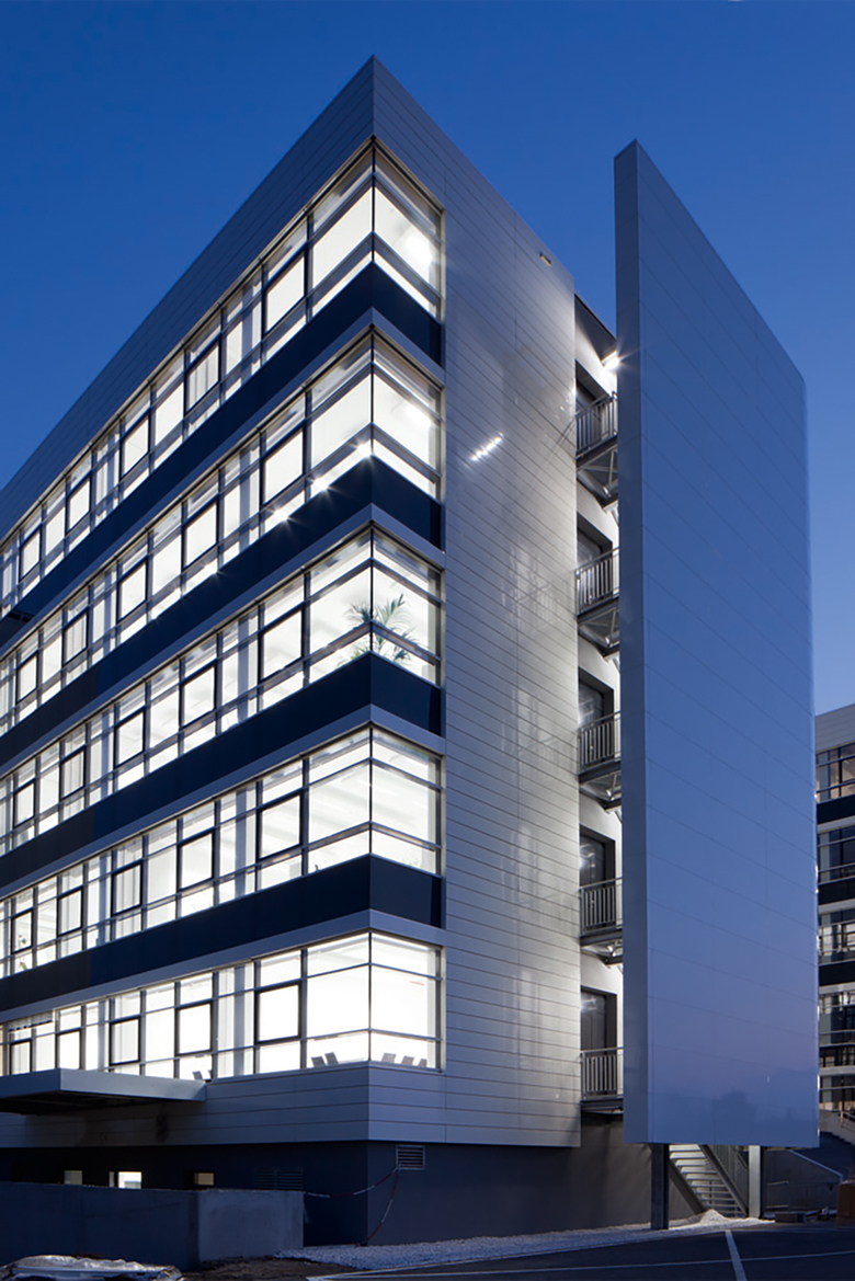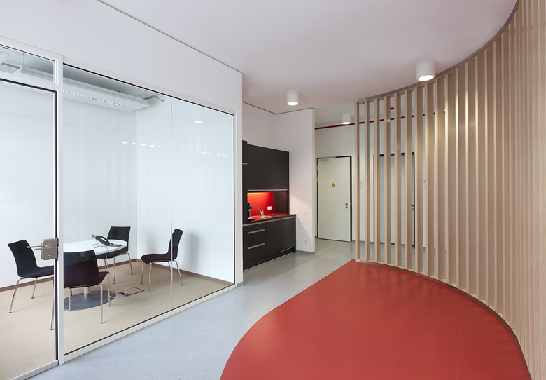 Für die komplexen Funktionszusammenhänge und die notwendige Flexibilität wurde eine klare identitätsstiftende Architektur geschaffen. Das Gebäude gliedert sich in den zentralen siebengeschossigen Hauptkörper mit den Prüfstands- und Laborbereichen und die sechs daran angrenzenden flexibel nutzbaren, sechsgeschossigen Büromodule.