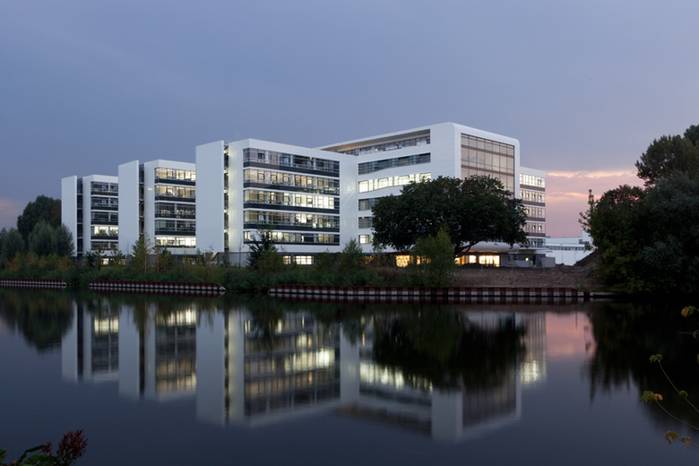 Der Neubau in direkter Wasserlage an der Spree in Berlin-Spandau ist eine Kombination aus Forschungs-, Büro- und Laborgebäude. Hier entwickeln bis zu 750 Mitarbeiter Technologien für Waschmaschinen und Wäschetrockner.