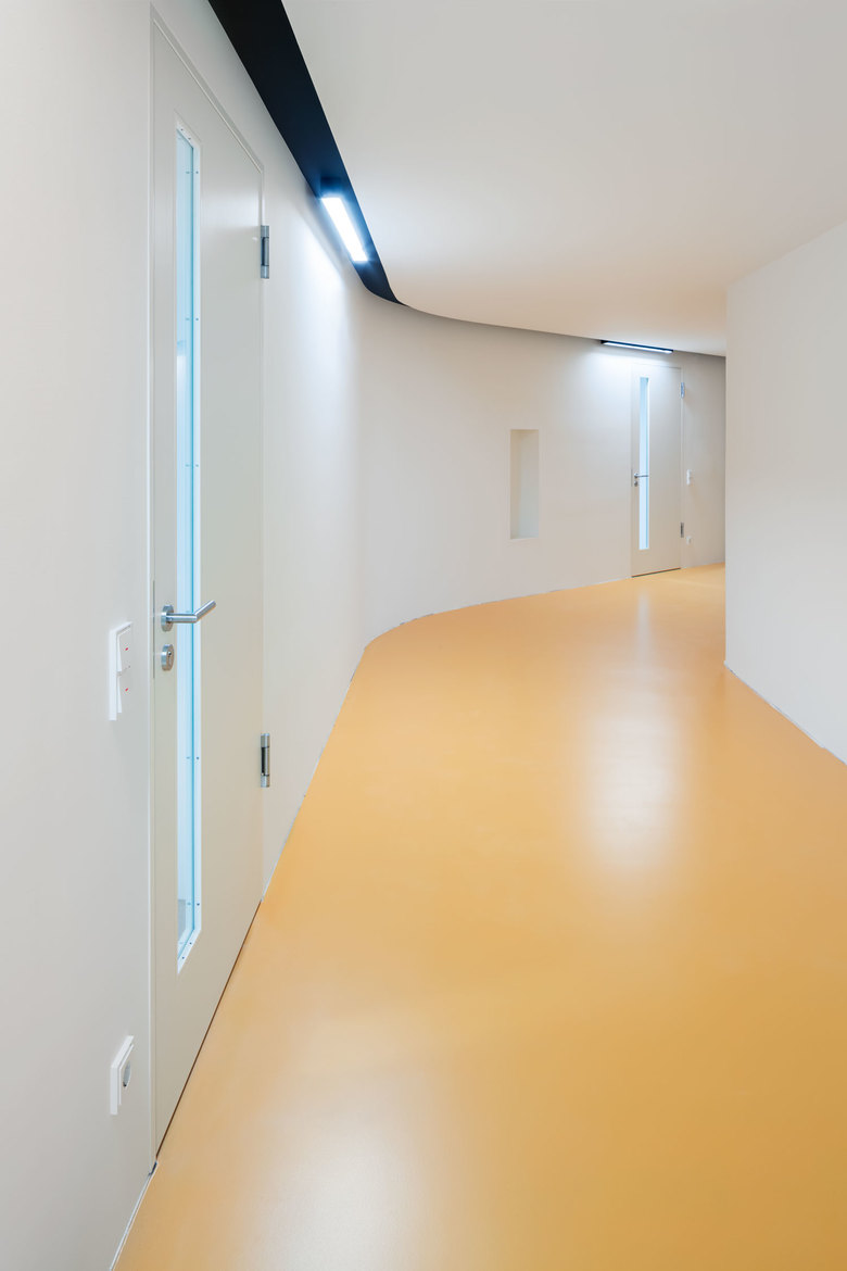 Die Fassade ist das verbindende Element des Entwurfs und bildet einen gestalterischen Bezug zur inhaltlichen Aufgabe des Instituts. Sie besteht aus feingliedrigen horizontalen Bändern aus heller Keramik, die je nach Nutzung der Räume, dichter oder lockerer angeordnet sind. Die homogene Keramikhülle sowie verschieden große Fensterformate verdeutlichen die Verschränkung der unterschiedlichen Nutzungen im Baukörper. Als „Beschichtung aus Keramik“ hält die alles umspannende dynamische Fassade die komplexen Arbeits- und Forschungsprozesse zusammen und transportiert zugleich die Themen des Instituts in einer identitätsstiftenden Architektur nach außen. Gleichzeitig sorgt die Kleinporigkeit der Keramik für eine extrem hohe Haltbarkeit und Langlebigkeit – was wiederum im Sinne der Nachhaltigkeit einen positiven Einfluss auf den Primärenergieverbrauch hat.