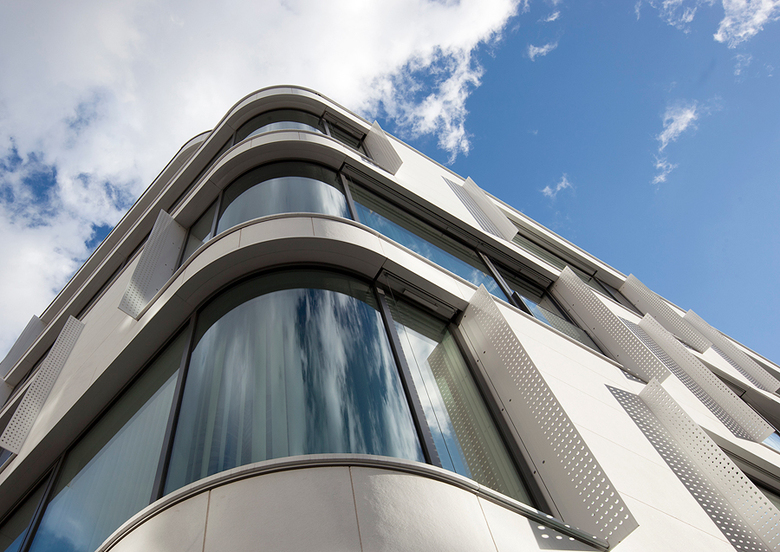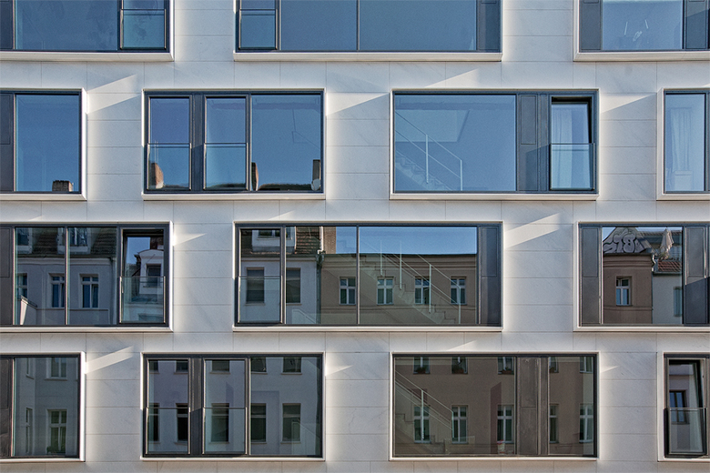 Die strahlendweiße Marmorfassade in Kombination mit zum Teil gerundeten Glasflächen verleiht dem Gebäude eine edle Eleganz, die sich von der bestehenden Bebauung der Spandauer Vorstadt eindrucksvoll abhebt. Großformatige, geschossweise versetze Fenster erzeugen eine lebendige, differenzierte Fläche, in die sich die großen Loggien in der Rückerstraße nahtlos einfügen. Die Fassade lebt durch die Präzision und Feinheit des Fugenbilds und ihrer ideenreichen Detaillösungen.