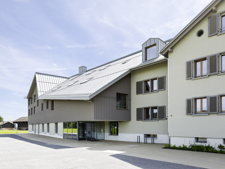 Angelehnt an typische Bebauungsformen ruraler Prägung werden Haupt- und Ergänzungsbau des Altersheims direkt aneinandergefügt, wobei das Dach zum wichtigen verbindenden Element wird. Ziel ist es dadurch eine Einheit sowohl im Äusseren (Gebäudekörper) als auch in der inneren Raumstruktur zu schaffen.