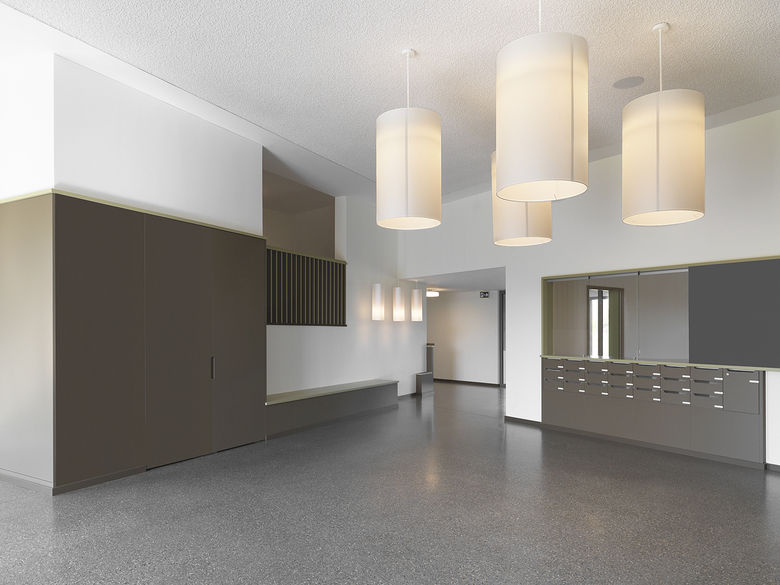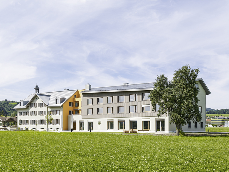 Die beiden Wohngruppen bestehen aus je 8 Zimmern im Alt- und im Neubau. In der Mitte befinden sich die Gemeinschafts- und Diensträume. Die beiden Gruppenräume sind über das tief nach unten gezogene Dach räumlich miteinander verbunden, so dass aus 2 Wohngruppen eine ganze Haus-Gemeinschaft entsteht. Während die Gruppenräume von der Blickbeziehung zum Dorf profitieren, sind die grosszügigen Aussenräume am Übergang zwischen Alt- und Neubau gegen Süden und die Berge hin orientiert.