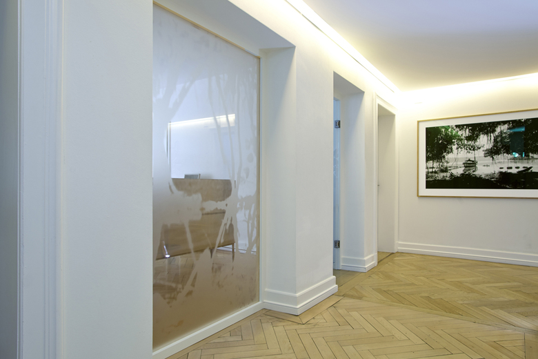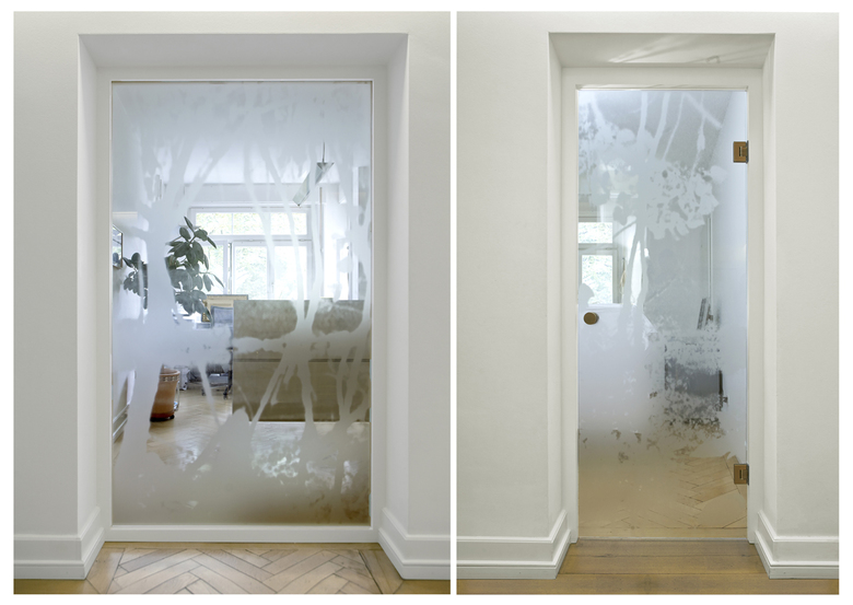 In einer dritten Etappe wird, nutzerspezifisch, eine Verglasung zwischen Wartebereich und Empfang eingebaut. Das Motiv nimmt Bezug auf das nebenan hängende Bild des Zürcher Fotografen Willy Spiller, mit welchem es zusammen entwickelt wurde. Die sandgestrahlten Gläser gewähren gleichermassen Transparenz und Privatheit.