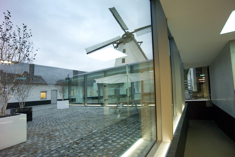 Extension and reconversion of an existing farm and mill site into a hotel – A formation of four concrete volumes gathers around a U-shaped farm building and a protected and renovated windmill. The old and new entities have no direct contact above the surface, though underground, there is a tunnel underneath the old farm, forming the base of the concept. Starting from the hotel reception to the south, the tunnel disappears under the inner square through a contemporary glass volume.