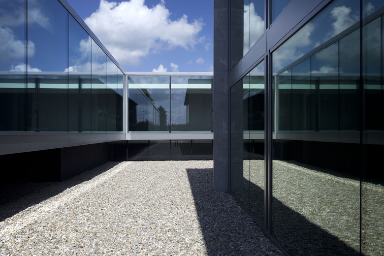 To the north, three entirely new volumes are visually separated from the mill and farm. Only a tunnel connects these volumes with the reception zone. The zone in between both entities above ground level is defined by an old cobblestone road that lays aside the farm, and leads us towards the landscape. 45 rooms, 34 standard & 11 suites along with an art gallery are dispersed in these northern volumes.