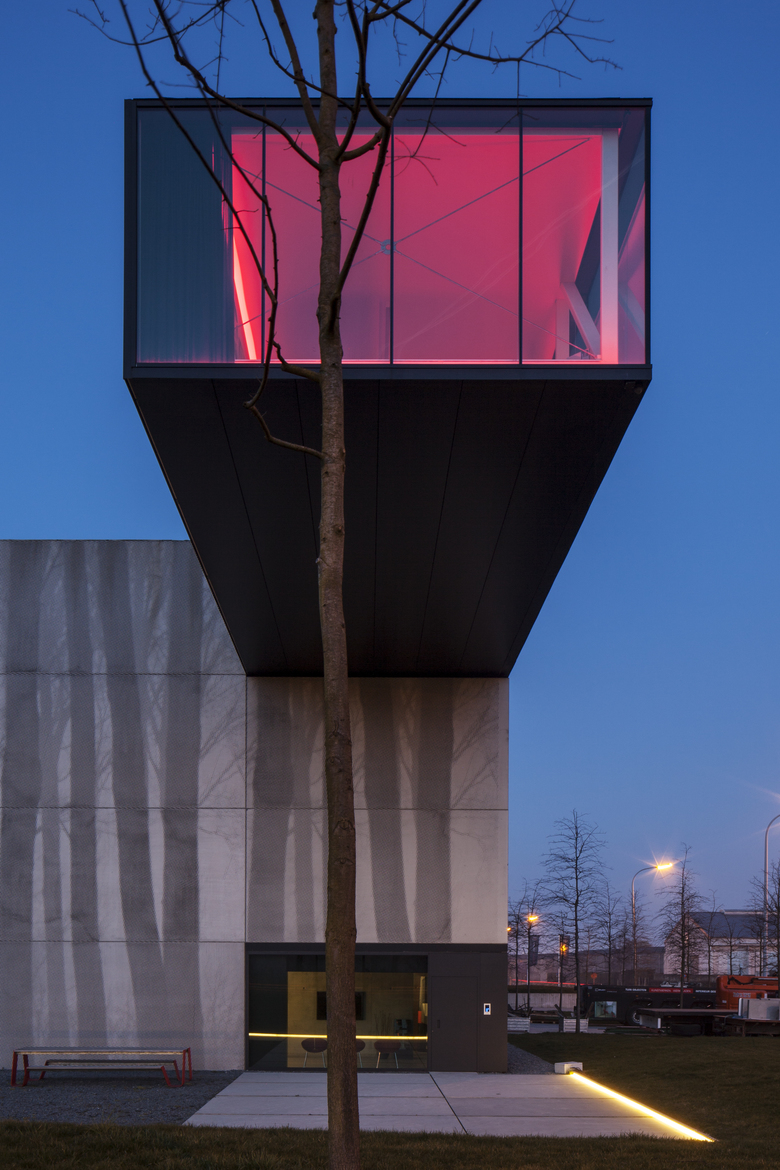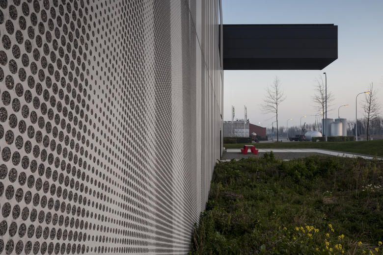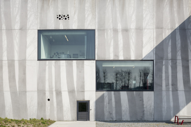 The industrial building is mainly a hall for production and storage, but also contains the office spaces. A cantilevered volume containing the meeting room is located at the top corner of the building. The facade is further characterized by printing a stylized image of the beautiful treeline along the canal “Damse Vaart” on the prefab slabs through the application of the Graphic Concrete procedure. This creates an interesting interaction between the building and its surroundings, as the building reflects the nature across the street and canal.