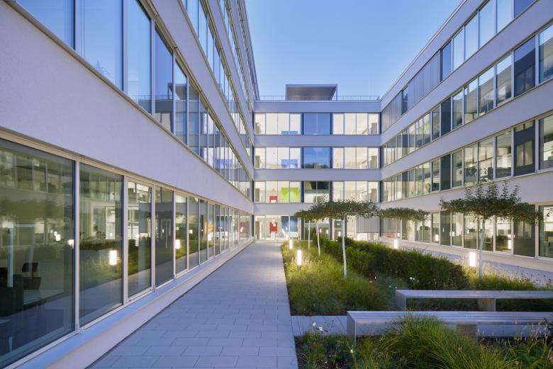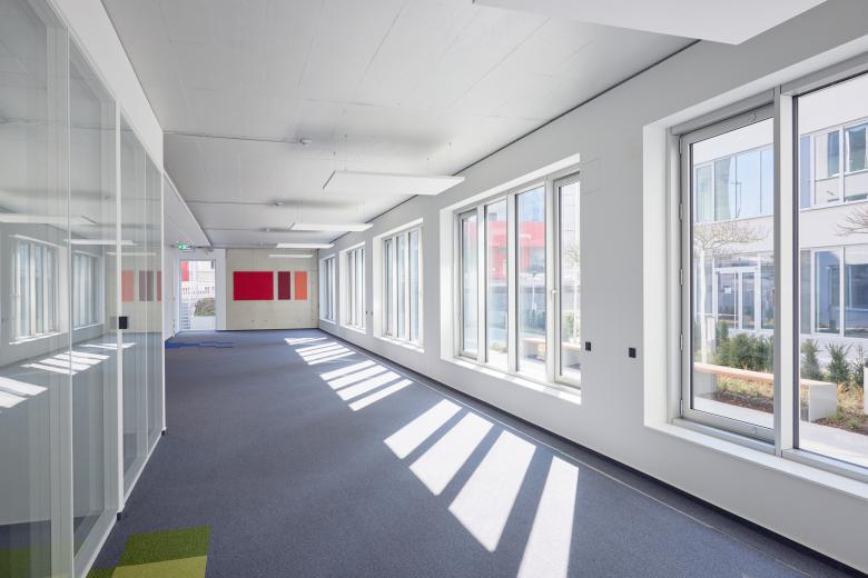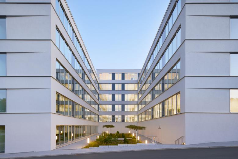 Der Zugang zum Gebäude erfolgt nordwestlich über einen terrassierten Vorplatz. Dem Foyer mit zentralem Empfang schließt eine Magistrale an, welche die einzelnen Büroriegel anbindet. Entlang der Magistrale liegen die gemeinschaftlich genutzten Besprechungs- und Aufenthaltsbereiche, weitere Servicebereiche angeordnet und die Erschließung. Die Regelgeschosse sind als Büroeinheit individuell und flexibel teilbar und können als Open Space, Gruppen- oder Zellenbüros ausgebaut werden. Jede Büroeinheit ist durch mittig liegende Multifunktionszonen mit Thinktanks, Meeting Points und Teeküchen gegliedert. Das fünfgeschossige Gebäude erhält auf den ersten beiden südlichen Gebäuderiegel und dem Riegel über dem Foyer ein sechstes Vollgeschoss. Von dieser Ebene werden zwei Terrassen auf den angrenzenden Dachflächen erschlossen. In den begrünten Innenhöfen sind Aufenthaltsbereiche mit Sitzbänken integriert.
