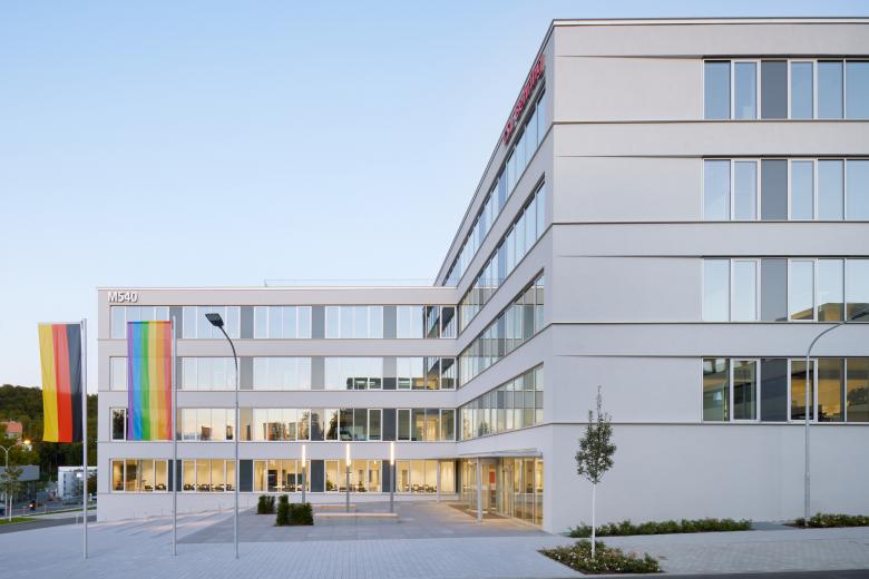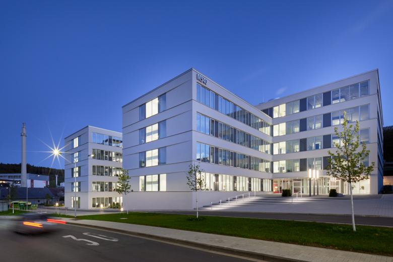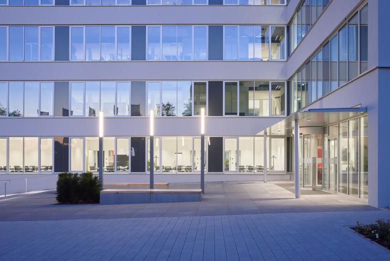 Der fünf bis sechsgeschossige Büroneubau wurde im Auftrag der Pharmaserv GmbH als Doppel-Kamm-Struktur auf einem leicht ansteigenden Grundstück am Pharmapark Behringwerke in Marburg errichtet.