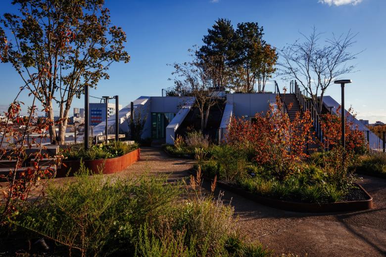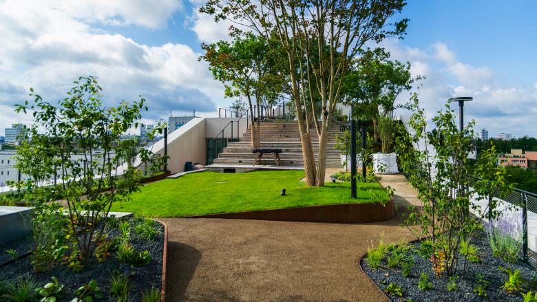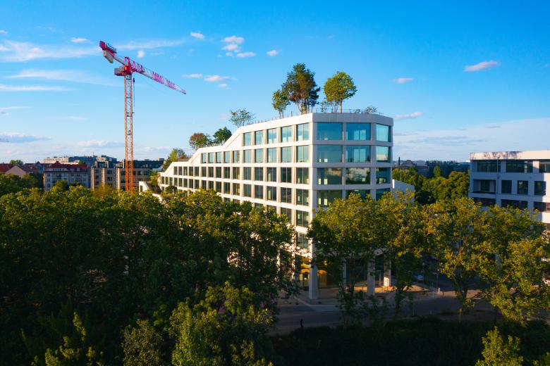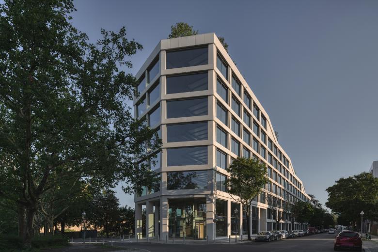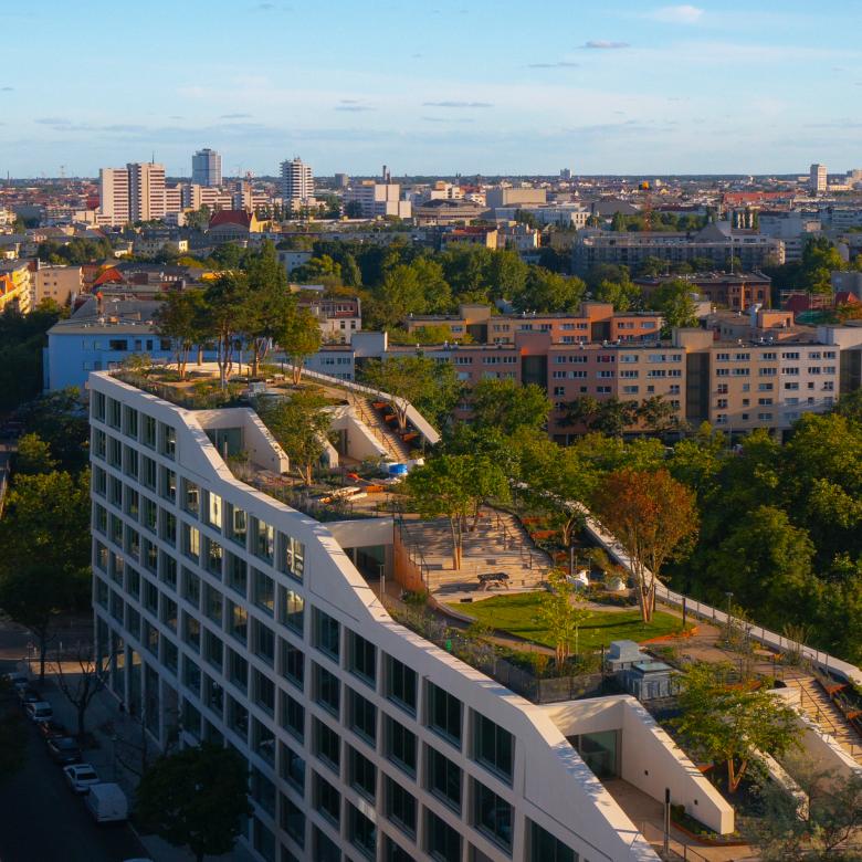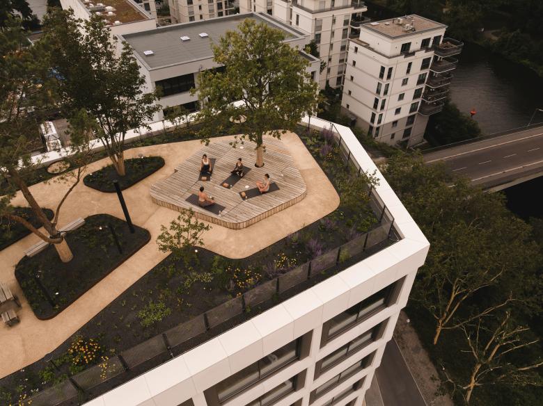 Ein großzügiger, 2.200 Quadratmeter großer Dachpark lädt mit seinen kaskadenartig angelegten Gärten zum Aufstieg ein – als Raum für Erholung, informelle Begegnungen und mit einem herrlichen Blick auf die Spree. Der Entwurf definiert das Gleichgewicht von Technik und Natur neu; Innen- und Außenräume gehen fließend ineinander über. Mit diesen fluiden Übergängen und den flexiblen Grundrissen ist das neue Bürogebäude offen für vielfältige Raumkonzepte. Über die vorgelagerten Kaskadengärten können die Arbeitsbereiche in jeder Ebene über großflächige Schiebetüren in den Außenraum erweitert werden. Der Dachgarten steht sowohl Mietern als auch Besucherinnen offen.