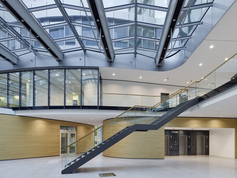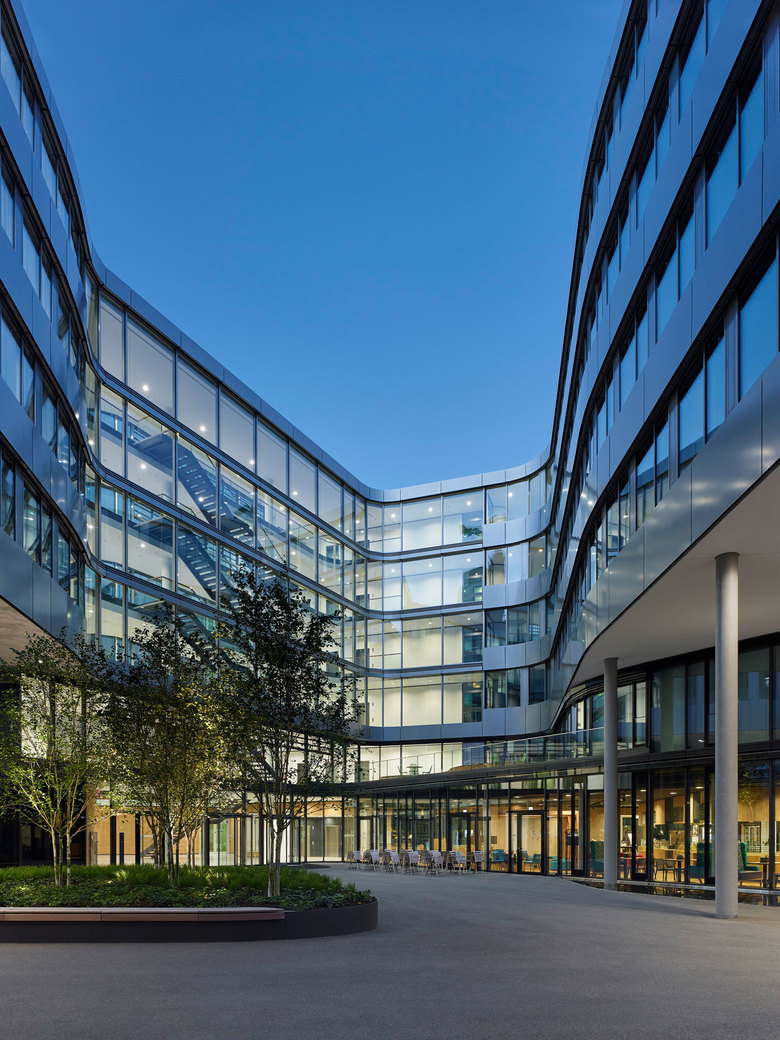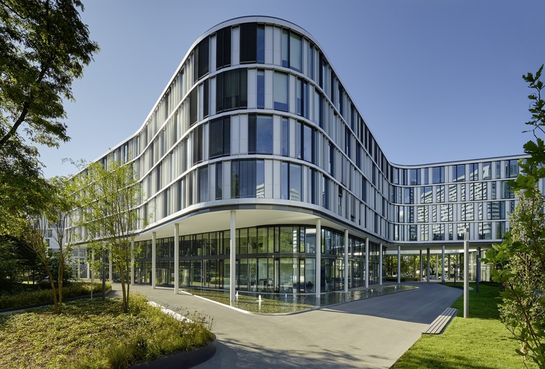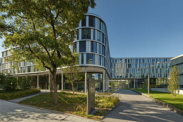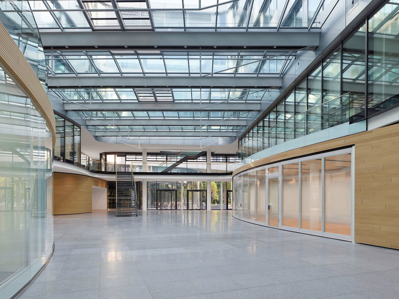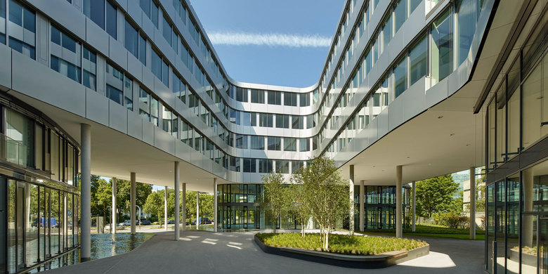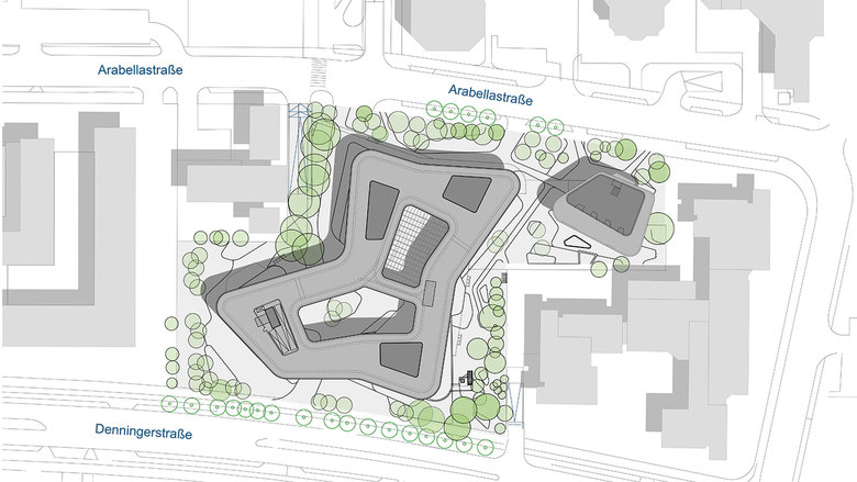 Der sechsgeschossige Neubau des Bürogebäudes ‘Arabeska’ steht auf dem Grundstück des rückgebauten Scheibenhauses aus den 60er Jahren an der Arabellastraße 30. Unter dem Leitbild ‘Arbeiten im Grünen‘ nimmt der frei geformte Baukörper durch vor- und zurückschwingende Fassaden die Bezüge der Umgebung auf und verbindet sich mit seiner organischen Architektursprache zu einer formalen Einheit mit der landschaftlichen Gestaltung der Freianlagen. Die zurückgesetzte Fassade im Eingangsbereich leitet den Besucher in einen mit Glas gedeckten Innenhof. Er ist mit seinen Holzdecks, Wasserflächen, dem Café und angrenzendem Foyer ebenso Durchgang wie Treffpunkt und Versammlungsraum für Veranstaltungen. Vier Kerne führen in die Büroräume in den Obergeschossen. Eine sehr flexible Raumkonzeption ermöglicht hier eine Vielzahl von Bürotypologien. Frei schwebende Stege zwischen den Innenhöfen verbinden die verschiedenen Gebäudeteile miteinander und sorgen für kurze Wege.