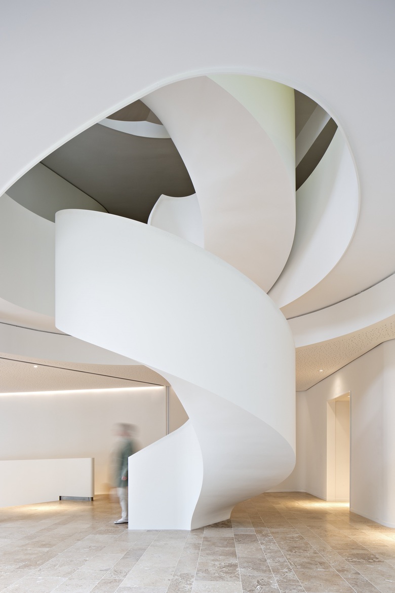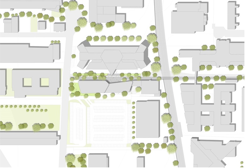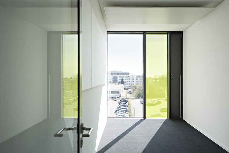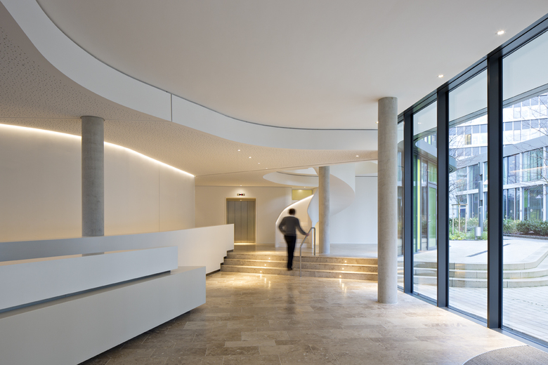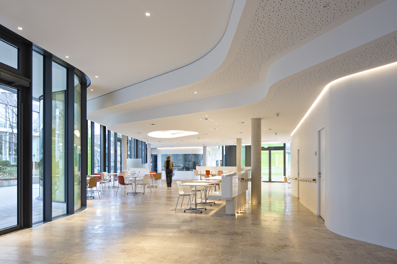 Unser Büro wurde 2010 mit der Planung des Neubaus von ‘Haus 5’ auf dem Firmengelände der GIZ in Eschborn beauftragt. Das Bürogebäude mit Kita fasst den Firmencampus im südwestlichen Bereich. Durch die vor- und zurückschwingende Fassade ergibt sich ein Vorplatz, der den eigenen Zugang ebenso betont, wie den des unmittelbar gegenüber liegenden Haupthauses. Die effizienten Grundrisse weiten sich in den Flurbereichen in unregelmäßigen Abständen zu Kommunikations- und Nutzungszonen auf und lassen stets einen direkten Sichtbezug zum Campus zu. Der Neubau schließt an das bestehende ‘Haus 4’ an, dessen Sanierung unser Büro ebenfalls übernommen hat. Die mit farbigen Glaspaneelen vertikal gegliederten Fassadenbänder des Neubaus greifen auf das sanierte Gebäude über und vereinheitlichen damit die Gesamterscheinung beider Häuser.