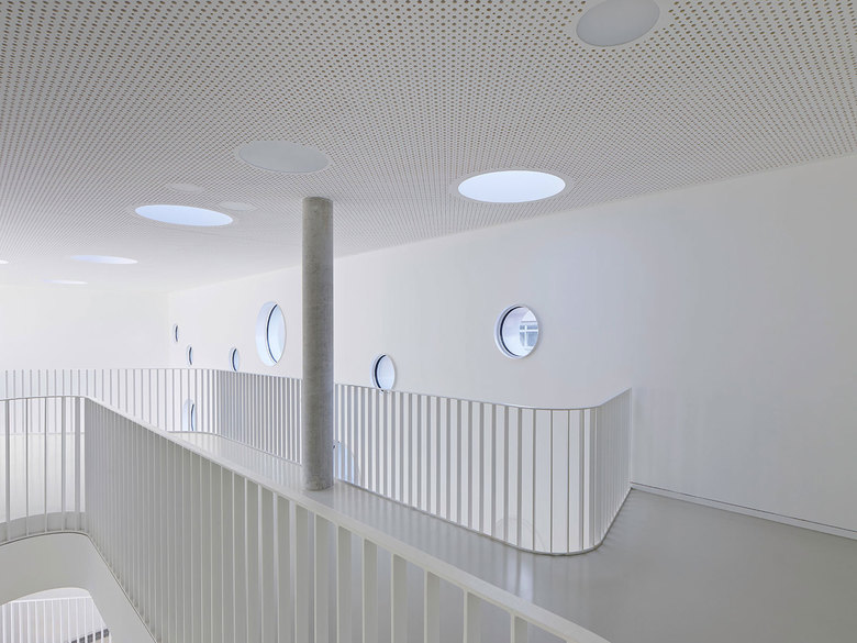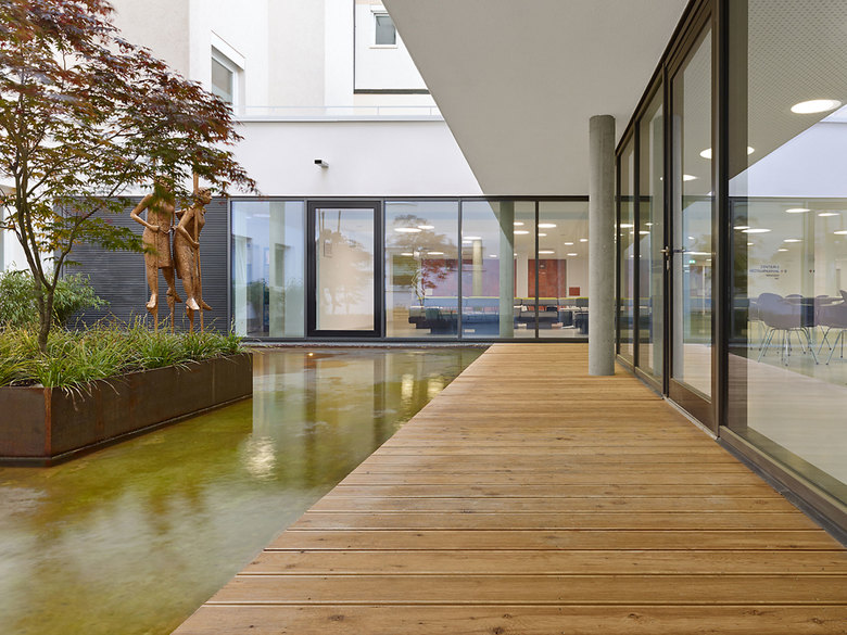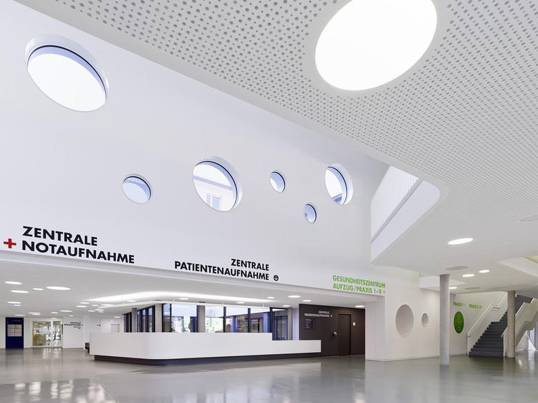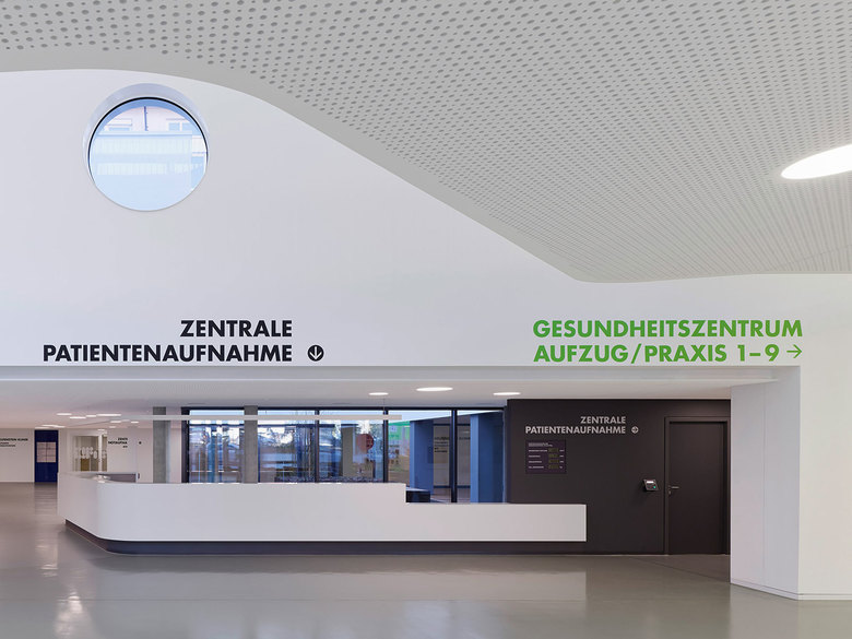 Der winkelförmige Neubau ergänzt den Bestand und schafft eine eindeutige Zugangssituation. Dabei nimmt sich der Baukörper in der Geschossigkeit gegenüber dem Bestand zurück und integriert gleichzeitig die Anbauten der bestehenden Klinik in der Sockelzone. Eine laubengangähnliche Erschließung entlang der grünen Innenhöfe ermöglicht eine leichte Orientierung im Haus. Tageslicht, freundliche Farben und naturnahe Materialien bestimmen das Erscheinungsbild und bringen eine hohe räumliche und funktionale Qualität.
