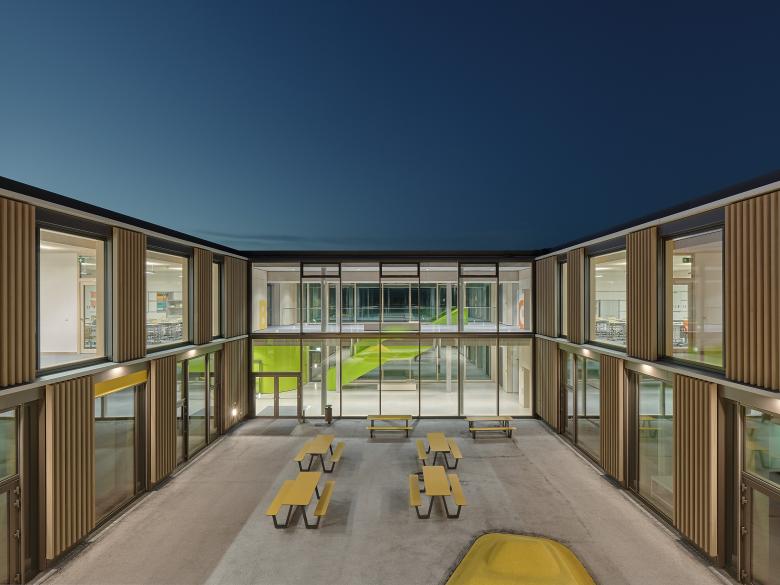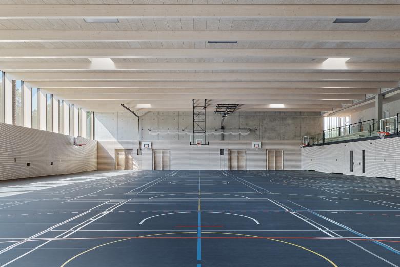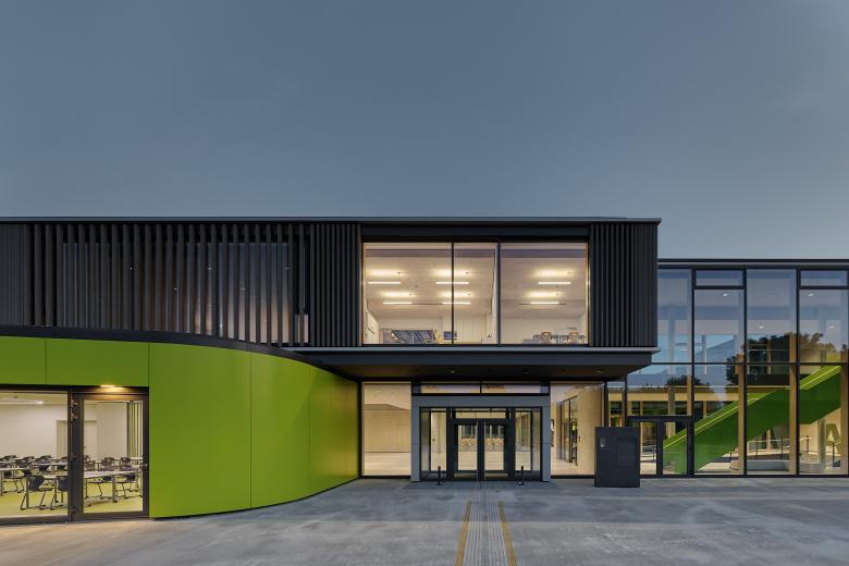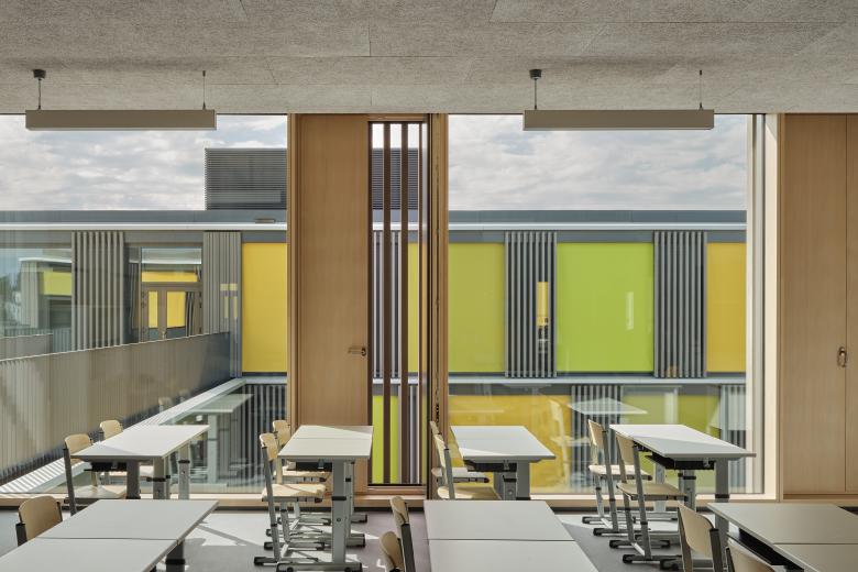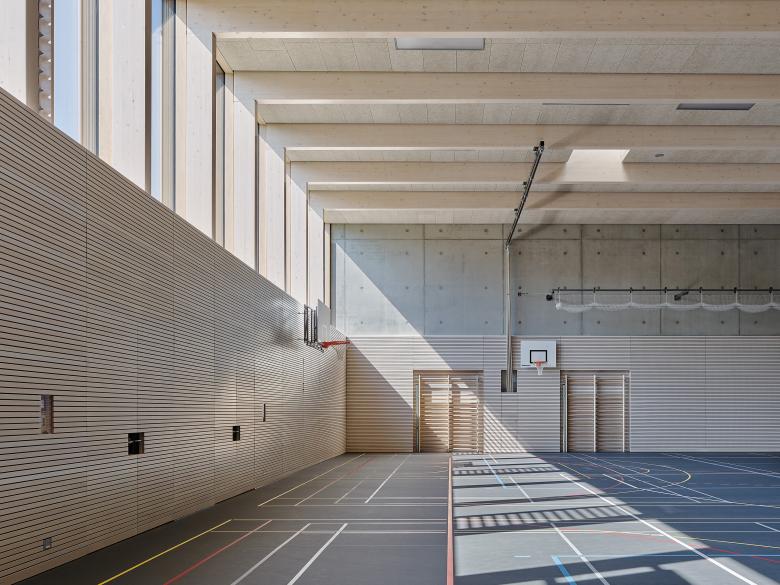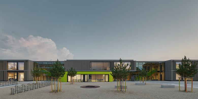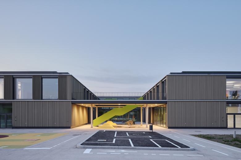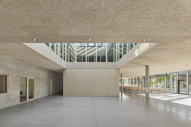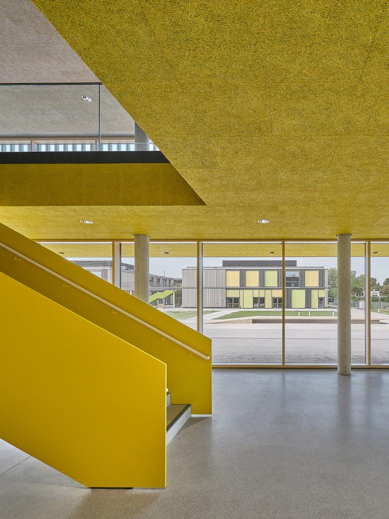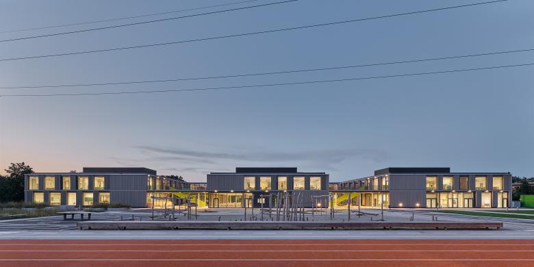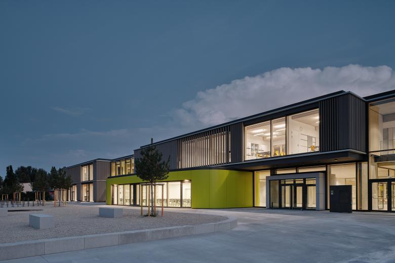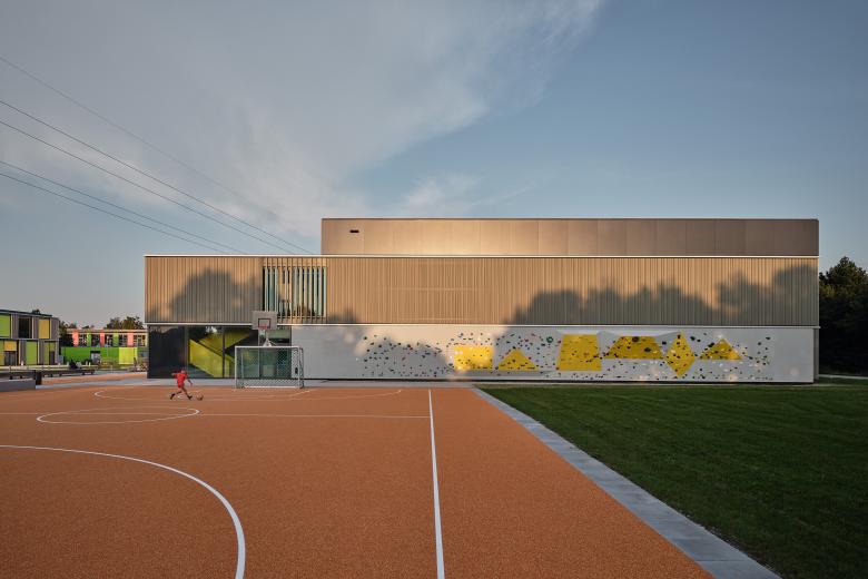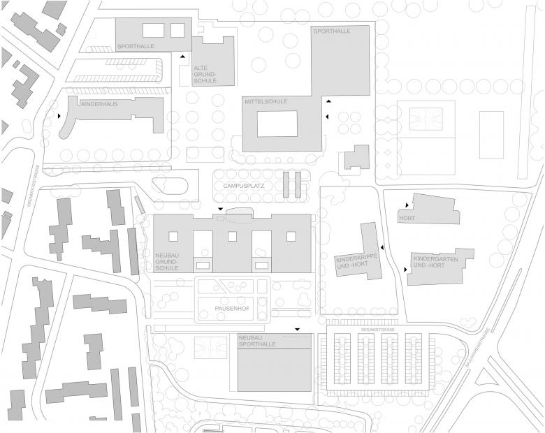 Die bestehende Grundschule Karlsfeld mit Sporthalle wurde 1962 errichtet und liegt in der Gemeinde Karlsfeld am nordwestlichen Stadtrand von München. Die Klassenräume entsprechen nicht mehr den heutigen technischen Ansprüchen und die Umsetzung aktueller pädagogischer Konzepte ist in diesen Räumlichkeiten nicht möglich. Zur Optimierung des Schulstandortes mit bestehender Mittelschule, Hort, Kindergärten und –krippen entstand daher südlich des Bestandsgebäudes der Neubau einer 6-zügigen Grundschule mit 3-fach Sporthalle. Das bisher nicht bebaute Grundstück wird bandartig von Nord nach Süd unterteilt. Den einzelnen Bändern sind eindeutige Funktionen zugewiesen. In graduellen Abstufungen werden Freiraum und Gebäude miteinander verwoben und so zu einem zusammenhängenden, sich in die Umgebung integrierenden Schulcampus entwickelt.