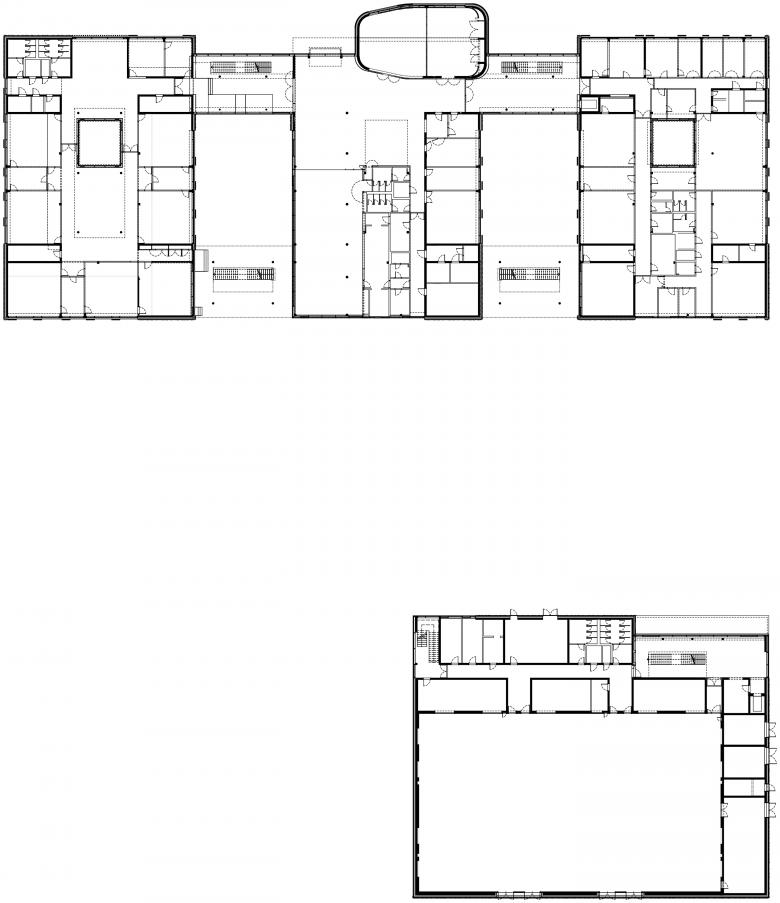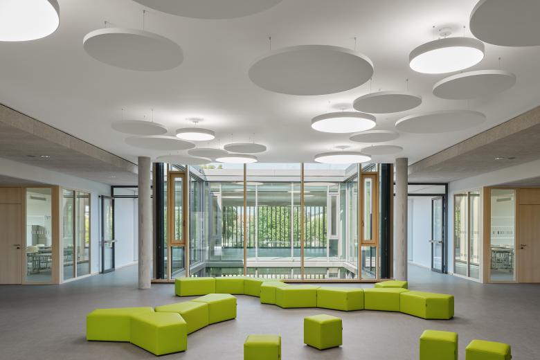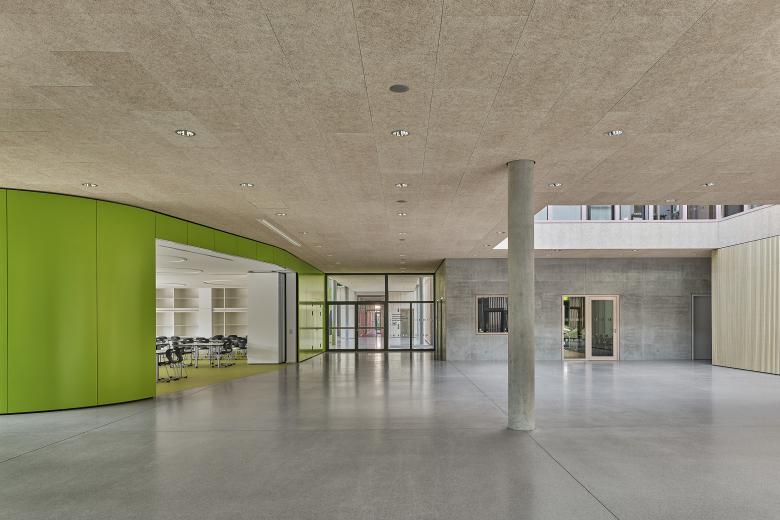 Leitidee für das Schulgebäude ist die aus dem pädagogischen Konzept heraus entwickelte bauliche Struktur mit Aufteilung der Nutzungen in funktional sinnfällige Teile: ein Schulhaus, in dem Lehren und Lernen als aktiver und interaktiver Prozess im Kontext der jeweiligen individuellen Rahmenbedingungen stattfinden kann. Das Gebäude selbst ist zweigeschossig und gliedert sich kammartig in drei Häuser. Dabei werden 4 Lerncluster und die zentralen Einrichtungen der Schule in einer bandförmigen Gesamtstruktur miteinander verwoben. Im zentralen Haus sind Foyer, Mensa und Mehrzweckbereich mit direktem Außenraumbezug angeordnet. Das Foyer als zentraler Treffpunkt und Kommunikationsort übernimmt die horizontale und vertikale Verteilung im Gebäude. Die drei Lerncluster der 2. – 4. Klassen bilden die Lernform im Obergeschossband. Die erdgeschossige Lage der Eingangsstufe entspricht den besonderen Anforderungen der Kinder am Beginn des Schullebens. Alle 6 Klassen eines Clusters sind um die zentrale Mitte, dem Herz des Clusters, angeordnet, was eine gleichberechtigte Partizipation an der gemeinsamen multifunktionalen Mitte ermöglicht. Differenzierungsräume liegen zwischen jeweils zwei Klassenzimmern. Teamräume am Eingang mit Blick auf den zentralen Mehrzweckbereich sind Rückzugs- und Arbeitsbereiche für die Lehrer.