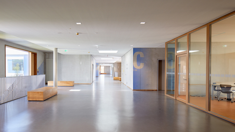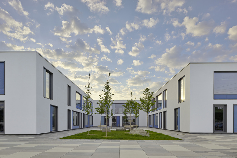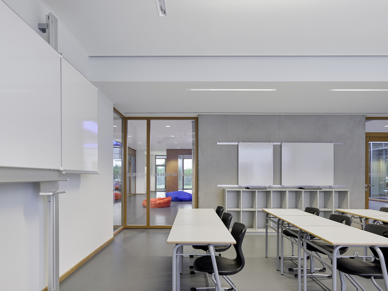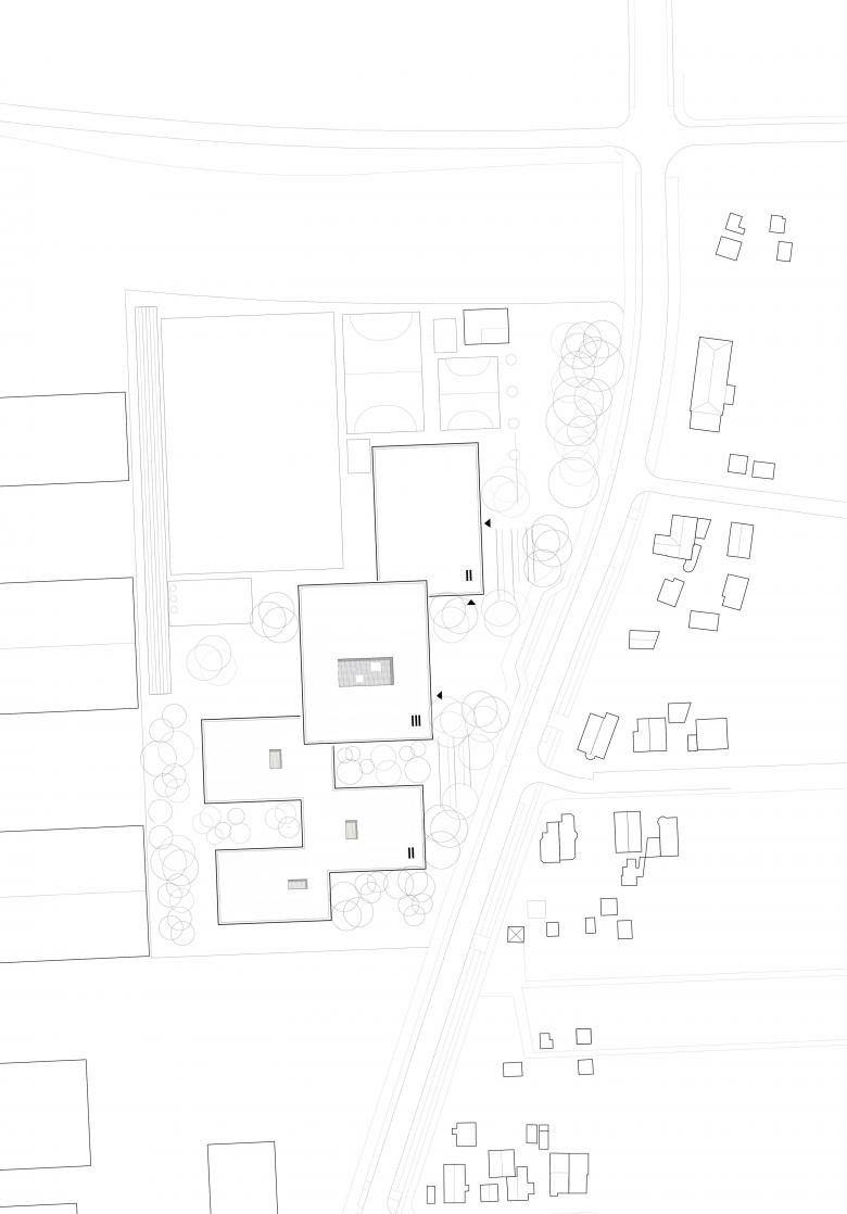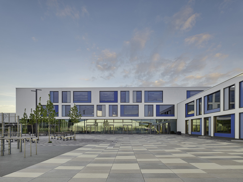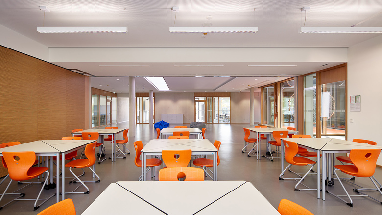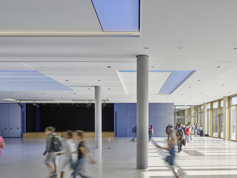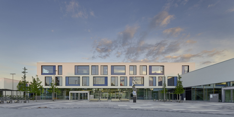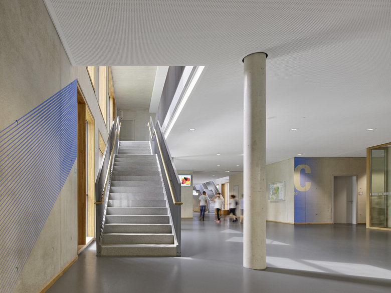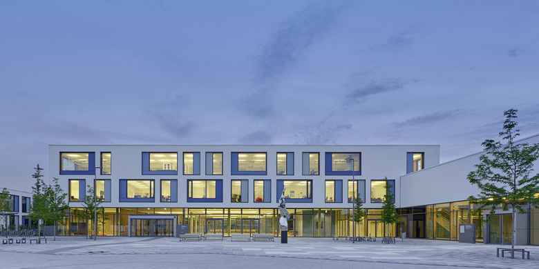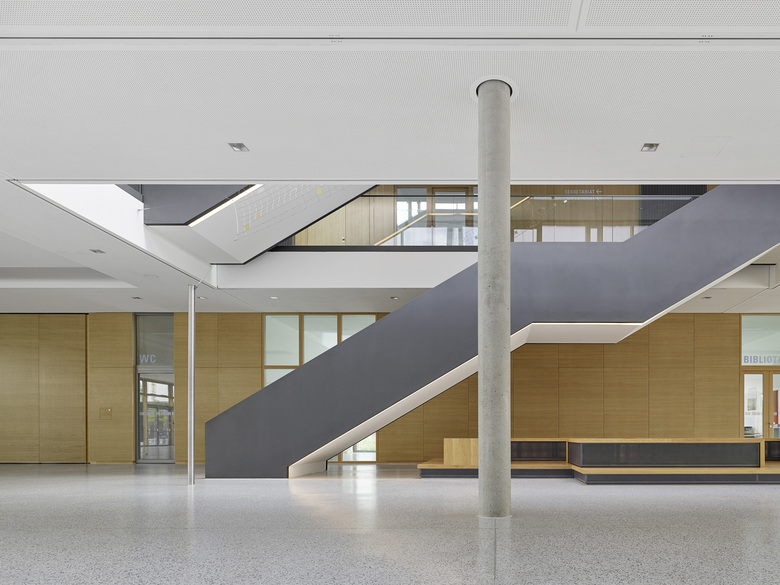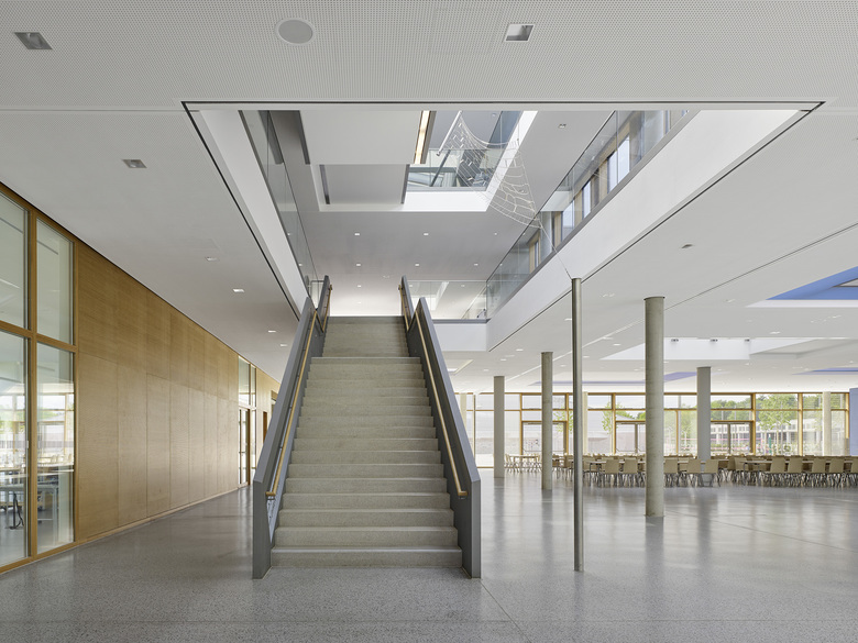 Der Entwurf organisiert Gebäude- und Freiflächen optimal auf dem vorgesehenen Baufeld. Das umfangreiche Raumprogramm wird auf fünf Baukörper nach dem Lernhauskonzept der Stadt München aufgeteilt: ein dreigeschossiges Haupthaus mit Aula, Mensa, Küche, Fachlehrsälen und Bibliothek, drei zweigeschossige Lernhäuser mit Klassen- und Teamräumen zur individuellen Förderung der Schüler/innen, sowie eine Dreifachsporthalle mit Zuschauertribüne und angrenzenden Freisportanlagen. Die Differenzierung in einzelne Baukörper unterstützt das übergeordnete Konzept. Das Gymnasium ist auf einen Ganztagesbetrieb ausgelegt.