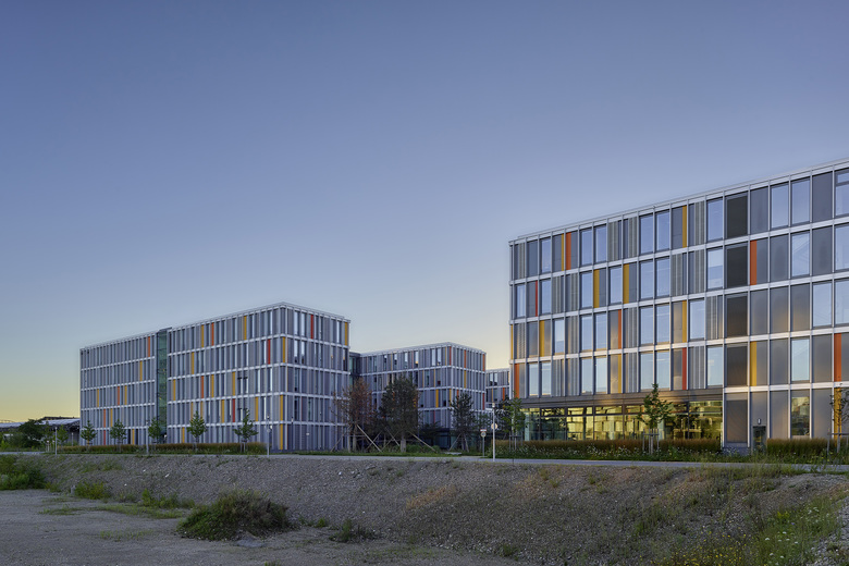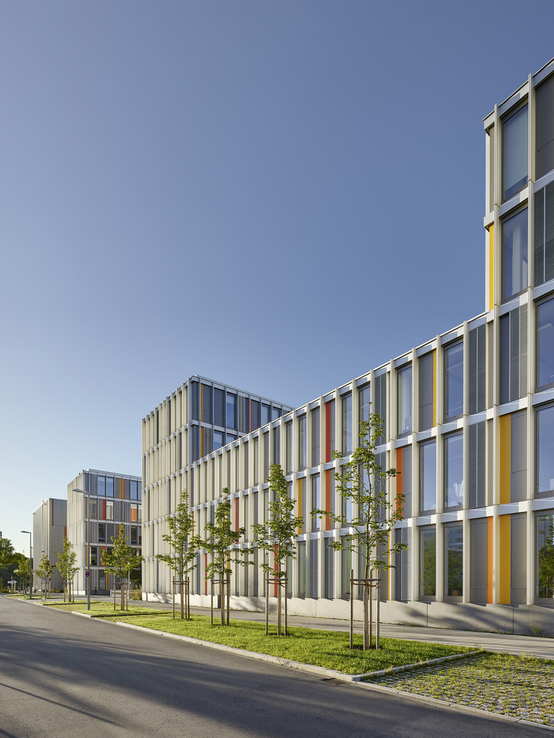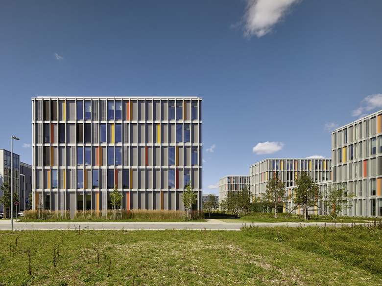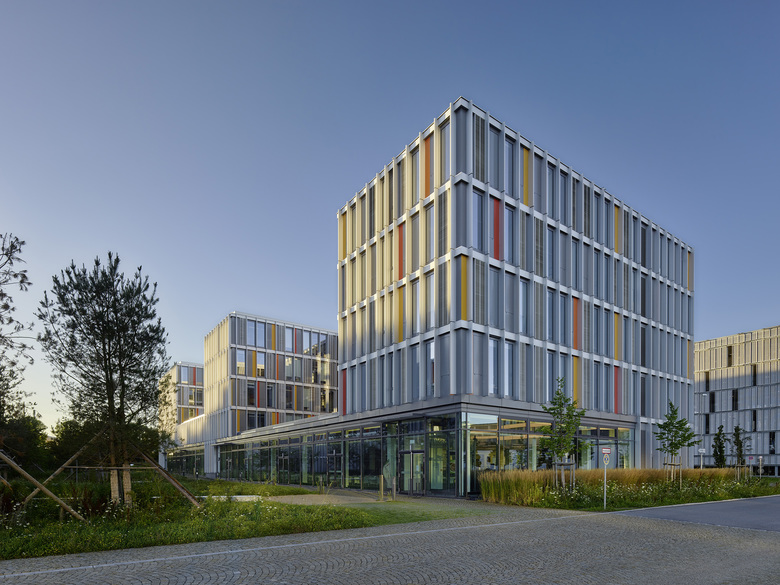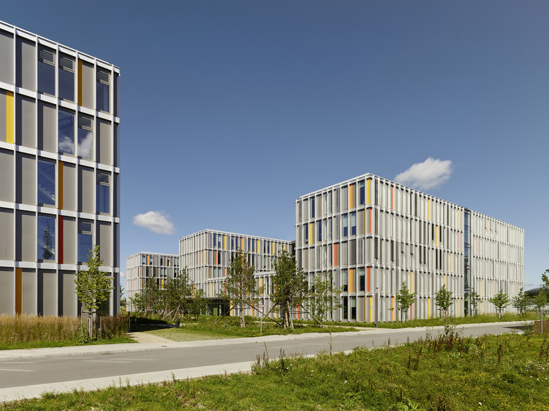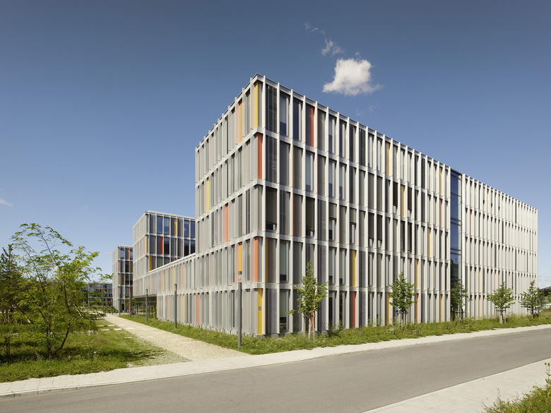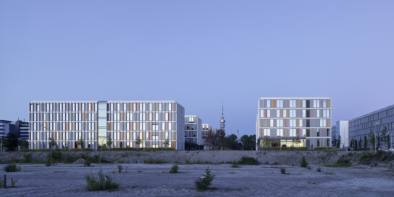 Auf dem Gelände des Technologieparks M-Campus der Stadtwerke München GmbH plante unser Büro nach dem Auftakt mit dem Technologiezentrum MTZ (2008) die Überbauung von zwei weiteren Entwicklungsfeldern: ein Rechenzentrum und ein Dienstleistungszentrum für die Stadt München. Das Gebiet des Technologieparks ist insgesamt in vier Entwicklungsfelder mit modularer Baustruktur gegliedert, die sukzessive realisiert werden. Die Haupteingänge aller Module sind dem zentralen Campusband zugewandt.