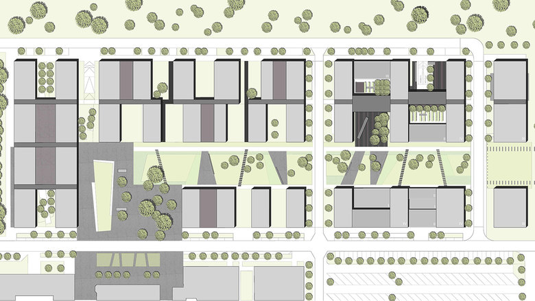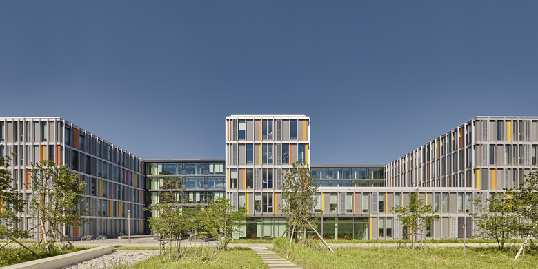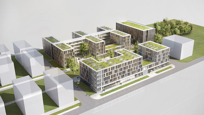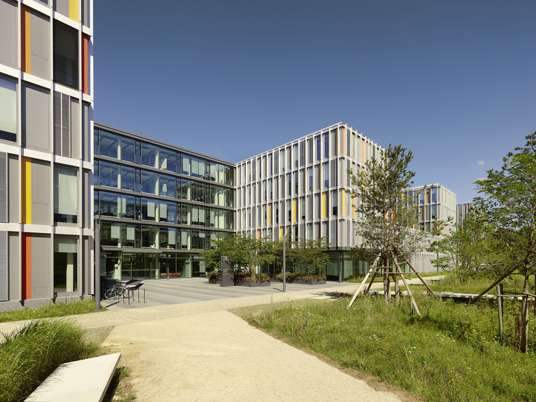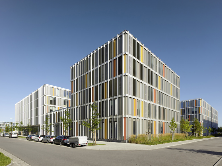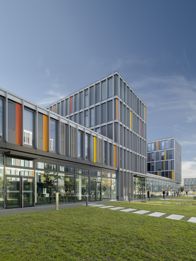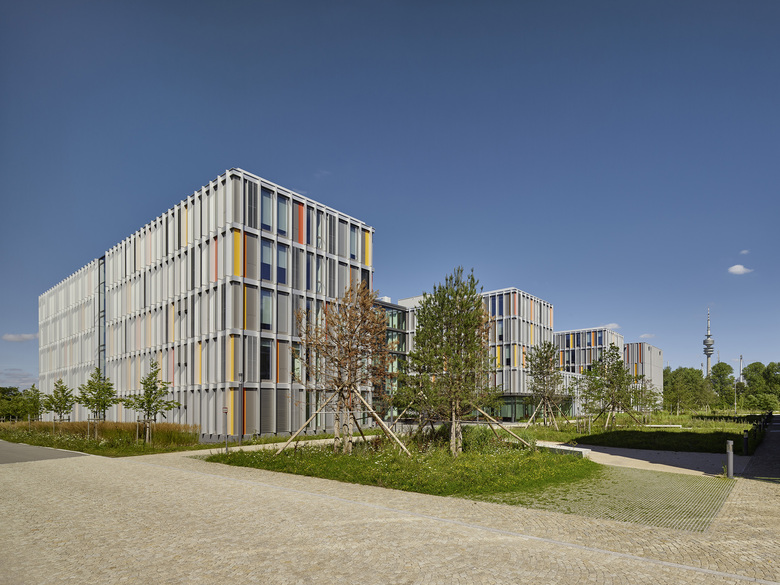 Auf dem Gelände des Technologieparks M-Campus der Stadtwerke München GmbH plante unser Büro nach dem Auftakt mit dem Technologiezentrum MTZ (2008) die Überbauung von zwei weiteren Entwicklungsfeldern: ein Rechenzentrum und ein Dienstleistungszentrum für die Stadt München. Das Gebiet des Technologieparks ist insgesamt in vier Entwicklungsfelder mit modularer Baustruktur gegliedert, die sukzessive realisiert werden. Die Haupteingänge aller Module sind dem zentralen Campusband zugewandt.