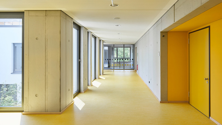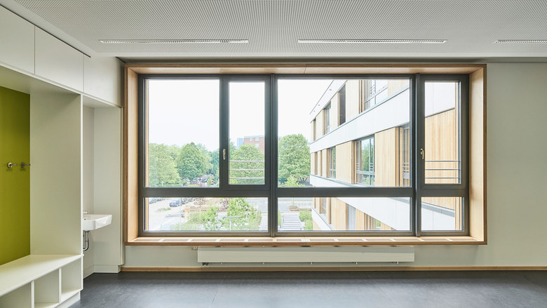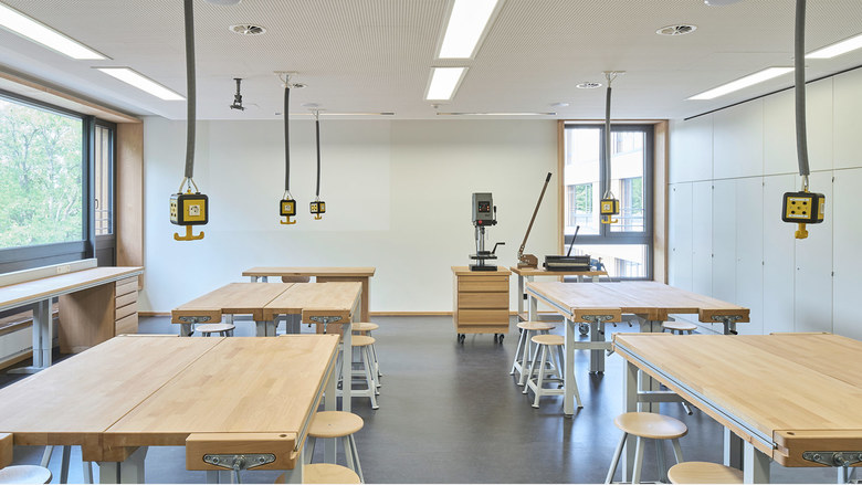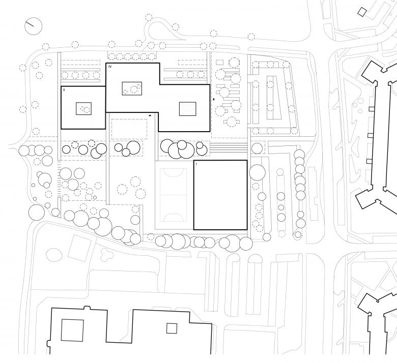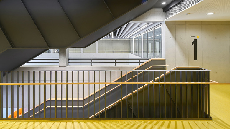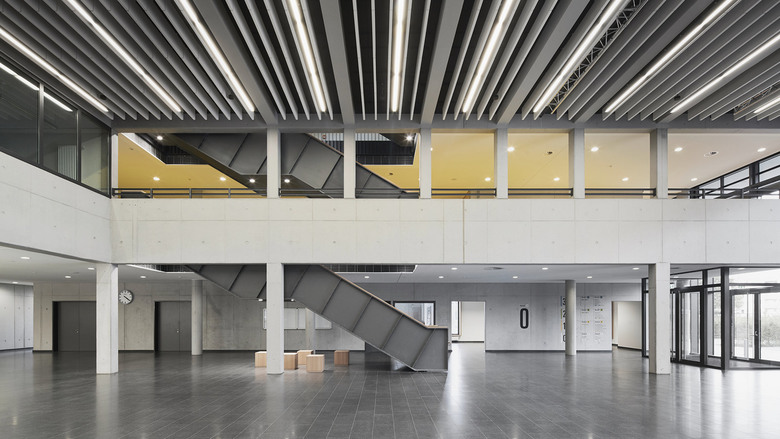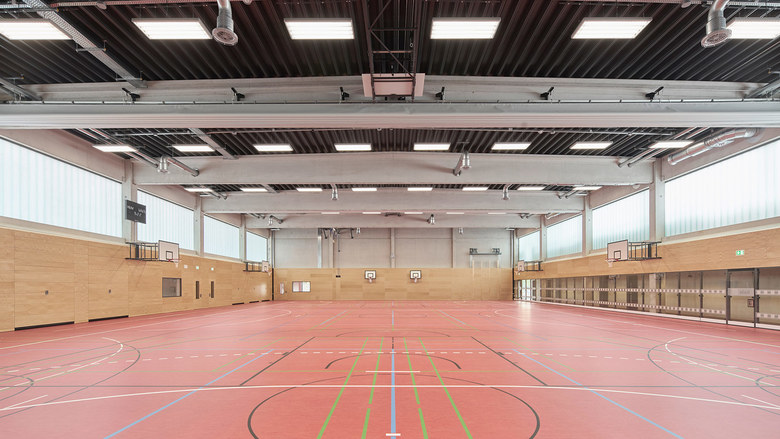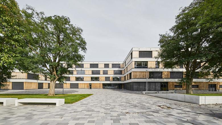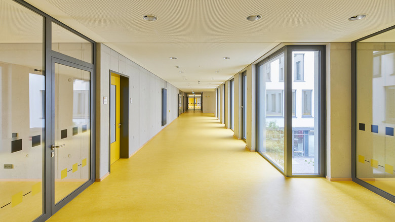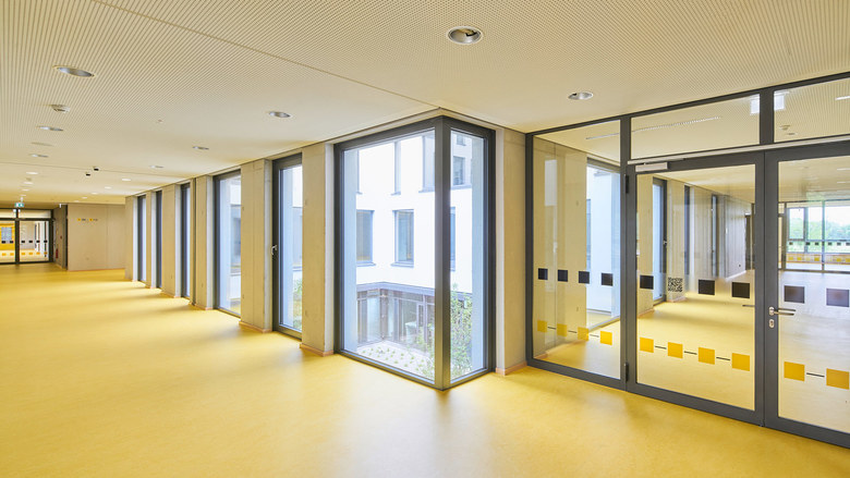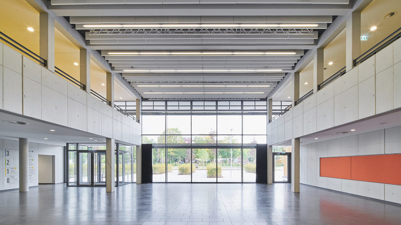 Ein viergeschossiger Hauptbaukörper bildet den Auftakt des Schulensembles. In diesem zentralen Baustein sind die Verwaltung, Fachklassen und öffentlichen Nutzungen wie Foyer und Aula, sowie die Mensa untergebracht. Das Foyer führt auf die innere Magistrale und übernimmt die horizontale und vertikale Verteilung im Gebäude. Angrenzend an das Foyer bildet die Aula mit zuschaltbarer Mensa den zentralen Veranstaltungsort in der Schule – eine Nutzungszuordnung, die die räumliche Mitte des Schulkomplexes stärkt. In den weiteren Baukörpern sind die Jahrgangsklassen untergebracht: freie und offen gestaltete Lernlandschaften mit Lerninseln, Ruhezonen und Freizeitbereichen ermöglichen innovative Lernformen. Um Innenhöfe organisierte Foren der Jahrgangsstufen ergänzen das schulische Angebot.