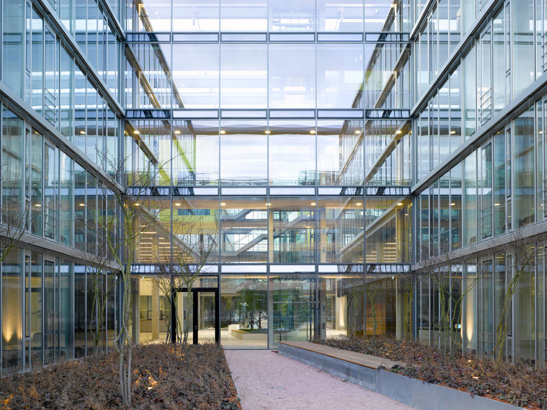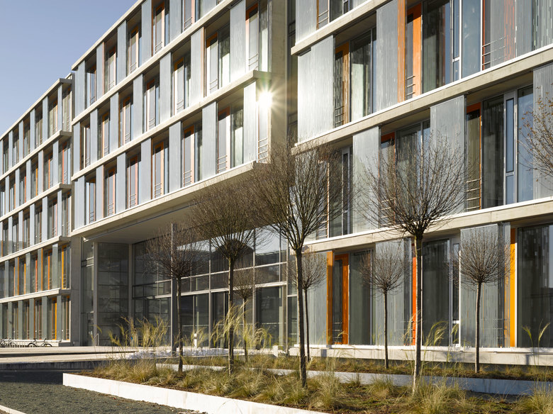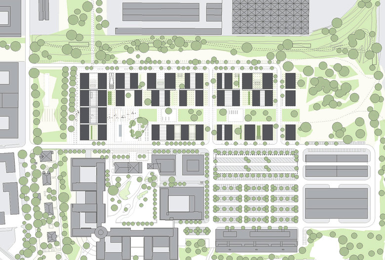 Der Campus mit einer Abfolge von Platz- und Grünflächen ist die gemeinsame Aufenthalts- und Bewegungsfläche für den Technologiepark. Die Gartenbereiche zwischen den Gebäudemodulen sind interne Aufenthalts- und Kommunikationsbereiche. So entseht eine Hierarchie in der Nutzung der Freiflächen, ausgehend von den großzügigen öffentlichen Freiräumen über die zentrale Mitte, zu den intimeren und kleinteiligeren Gärten in und zwischen den Modulen.