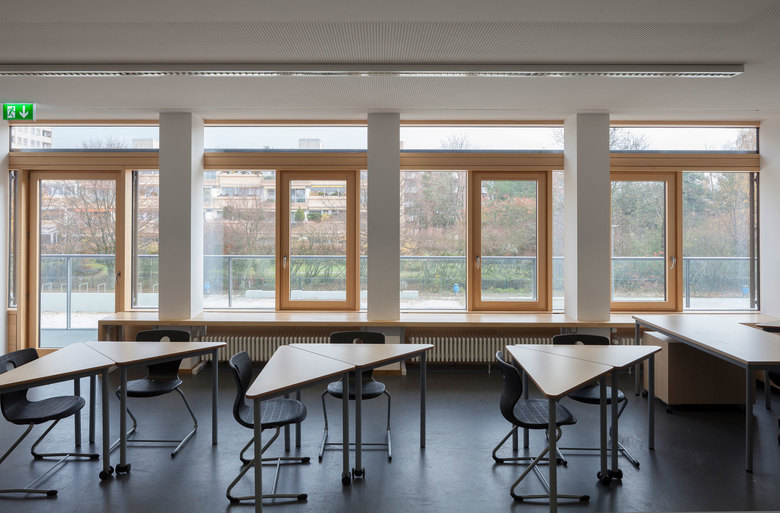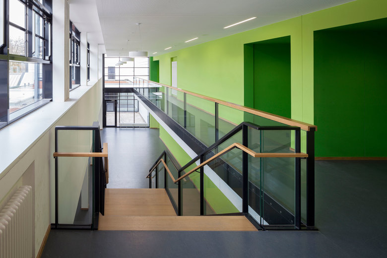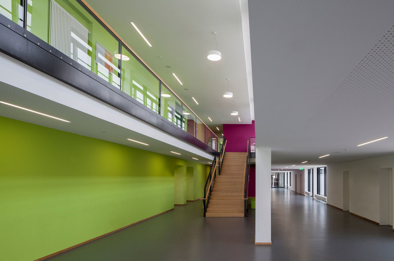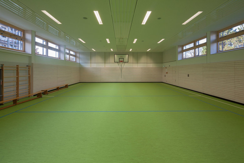 Durch die Anordnung einer neuen, offen gestalteten Treppe konnte der Raumbedarf des ehemals dreigeschossigen Klassentraktes in zwei Geschossen untergebracht werden. Anstelle der ehemaligen Treppenhäuser werden die Klassen so organisiert, dass die Anzahl der Klassen gleich bleibt. Diese Maßnahme verbesserte die Erschließungssituation und führt durch die Reduzierung des umbauten Raumes zu einer nachhaltigen und energieoptimierten Sanierung. Das neu eingeführte Farbkonzept im Innenraum gewährleistet eine gute Orientierung und unterstützt das pädagogische Konzept der Schule. Die zweigeteilte Turnhalle mit Geräte- und Technikräumen konnte durch die Sanierungsmaßnahmen als Versammlungsstätte für 290 Personen ausgebildet werden.
