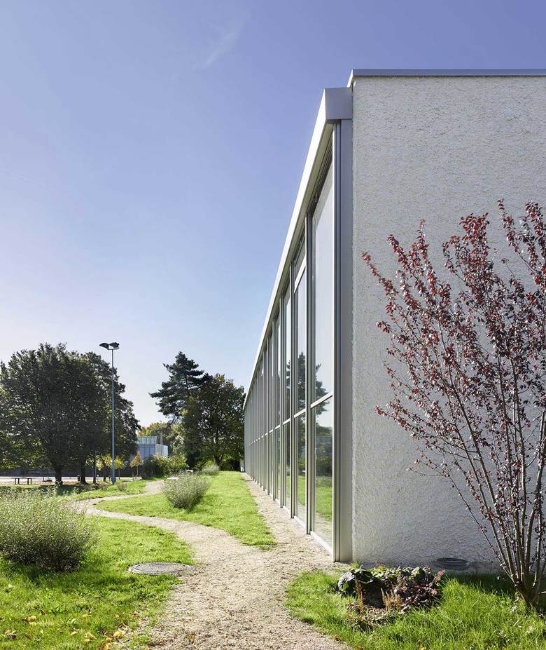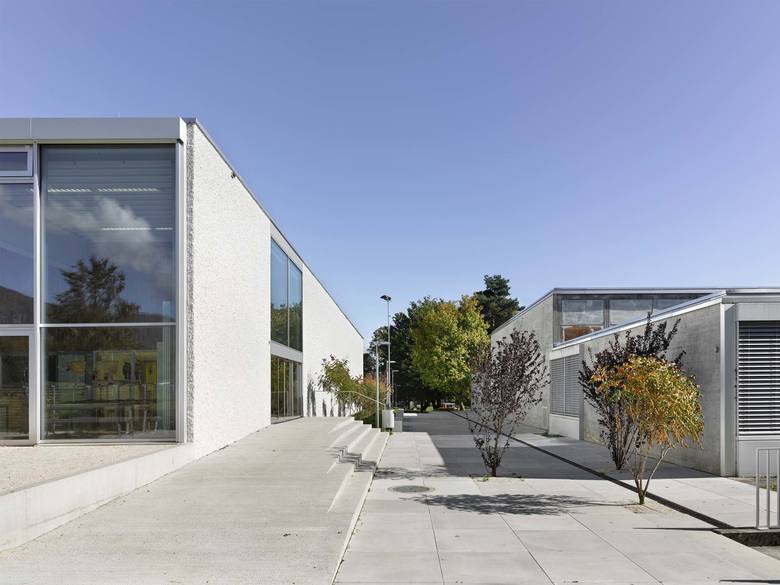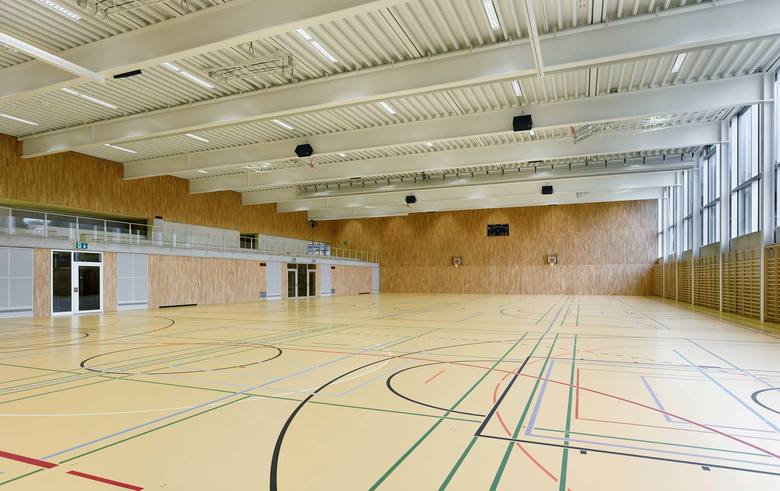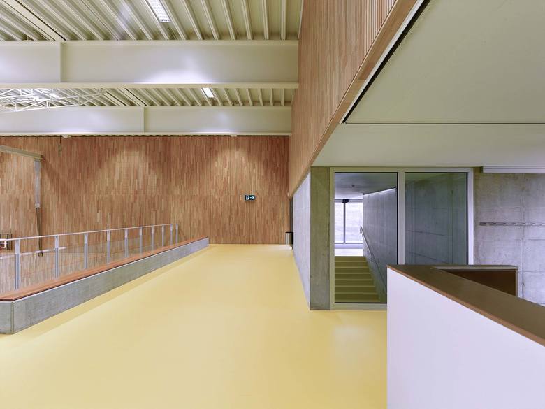 Beide Seitenwände aus Sichtbeton sind mit einem groben Kellenwurf verputzt und mit zwei grossen Glasfronten aus eloxierten Aluminiumprofilen kombiniert. Die Stahlträger mit einer weissen Profilblech-Eindeckung überspannen die Sporthalle und die Werkräume. Die Innenwände der Halle, Teile der Galerie sowie der Werkräume sind mit Lärchenholz beplankt.