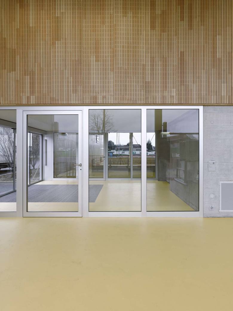 Die beiden Glasfassaden stehen quer zum Hang und geben den Blick auf die Bergsilhouette des Jurasüdfusses frei. Nach Betreten des Gebäudes erreichen die Nutzer direkt die Zuschauergalerie. Ostseitig befindet sich die abgesenkte Dreifachturnhalle und im westlichen Gebäudeteil sind die Werkräume untergebracht. Ein Zwischenbau trennt die beiden Bereiche und nimmt die Nebenräume auf. Im Untergeschoss befinden sich nebst der Halle die Garderoben- und Geräteräume.