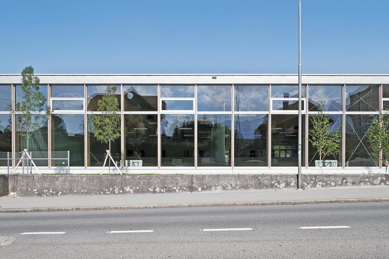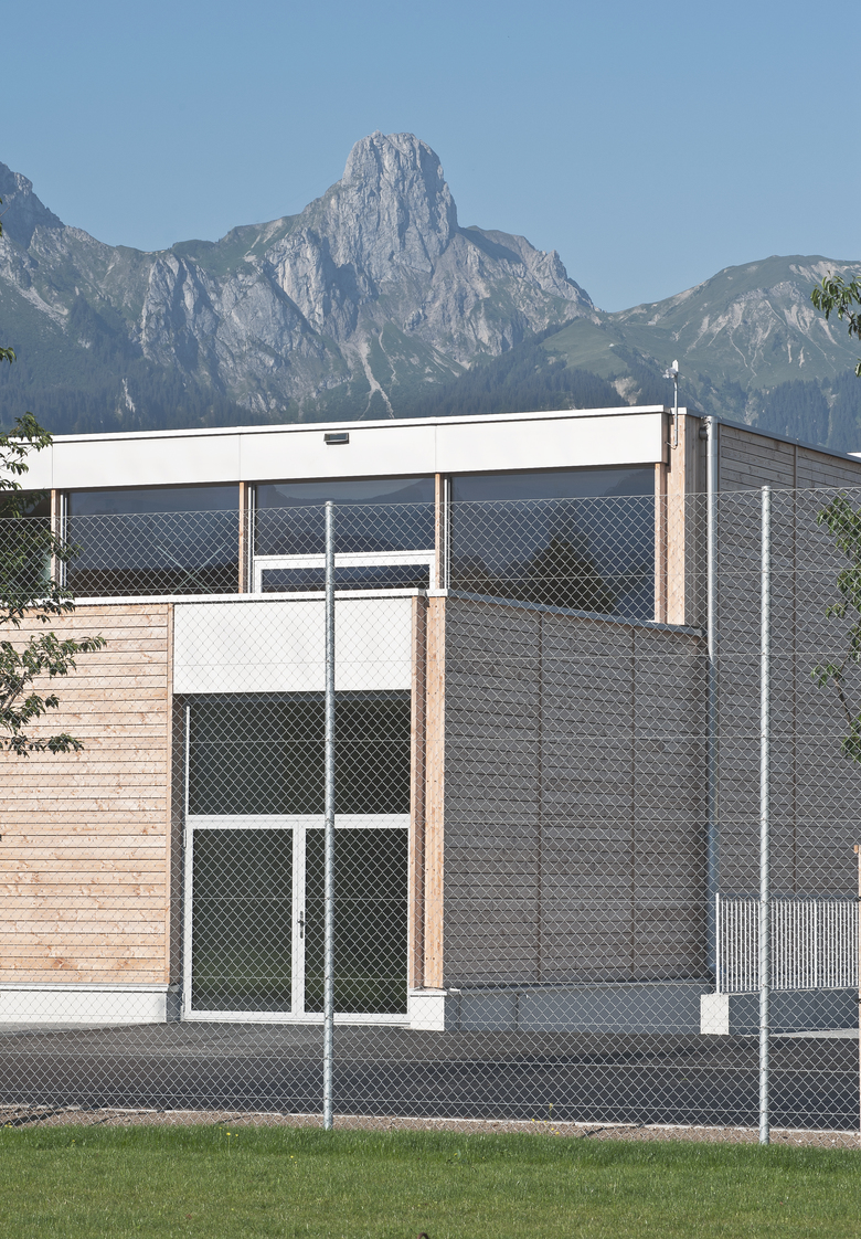 Die neue Sporthalle Schadau ergänzt die Bauten des gleichnamigen Gymnasiums in Thun. Der neue Gebäudekörper wird direkt an der stark befahrenen Frutigenstrasse, als Abschluss der Wohnbauten platziert. Über das Absenken der Halle und die filigrane Materialisierung fügt sich der grosse Neubau harmonisch in das kleinmassstäbliche Wohnquartier ein. Der Neubau wird ab der Oberkante des Terrains aus Holz erstellt und mit einer feingliedrigen Douglasien-Fassade bekleidet, welche im Laufe der Zeit natürlich verwittert. Durch die grosszügigen Verglasungen und die Repetition der einzelnen Elemente erhält der Hallenraum eine ruhige, lichtdurchflutete Stimmung. Prägende Materialien sind helles Fichtenholz im Zusammenspiel mit Sichtbeton und einem lindengrünen Sportboden.