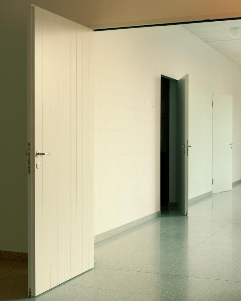 Das Holztragwerk des Daches schafft in den Unterrichtsräumen eine warme Atmosphäre und nimmt in den Zwischenräumen die Leuchten auf. Einzelne Elemente wie Schränke, Kleiderhaken und die Fenster werden farbig behandelt und werden damit bewusst von den weissen Wänden und dem Holztragwerk abgelöst.