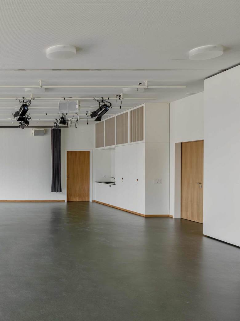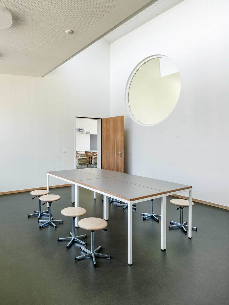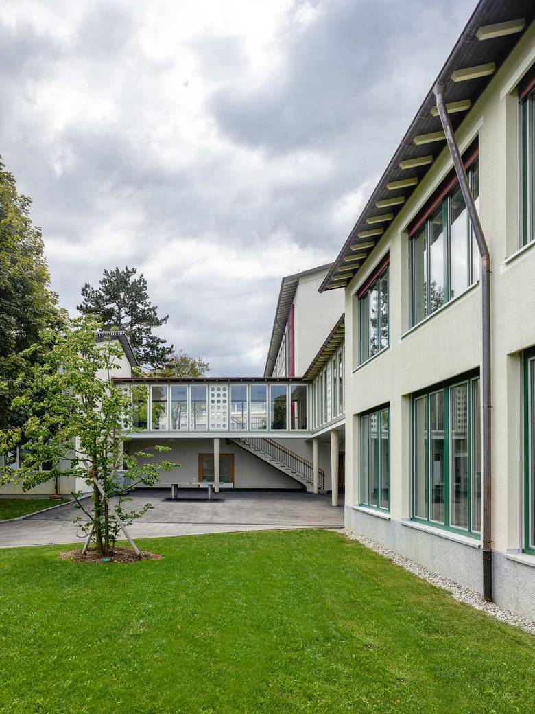 Die Grundrisstypologie des zweigeschossigen Gebäudes entwickelt sich aus dem Bestand heraus. Pro Stockwerk sind jeweils vier Schulzimmer entlang eines breiten Korridors angeordnet. Zwischen den Schulzimmern eingefügte Gruppenräume brechen den Korridor auf und eröffnen spannende Querbezüge. Mittels des überhohen Erdgeschosses und der gefalteten Dachfigur werden so alle Räume optimal belichtet.