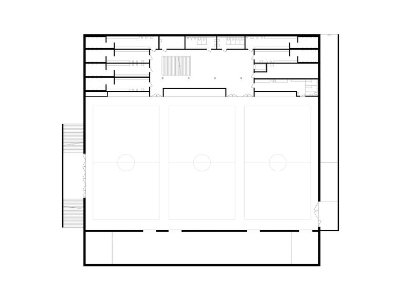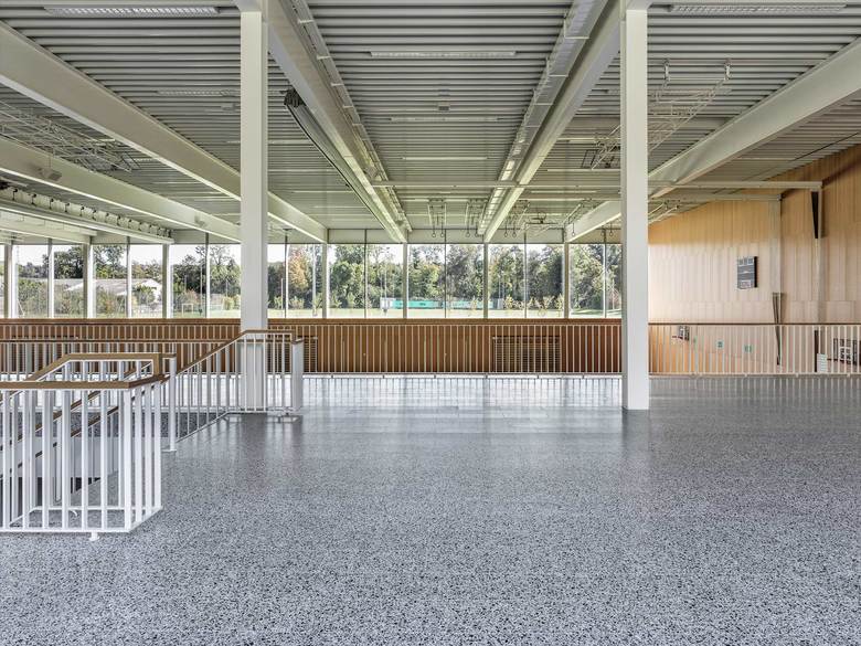 Im Gegensatz dazu sind die beiden Seitenfassaden mit einem groben, zweifarbigen Kellenwurfputz behandelt. Die erdigen Farben nehmen Bezug auf die Natur und fügen das Gebäude selbstverständlich in den Grünraum ein. Im Innenraum schaffen die mit Douglasienholz bekleideten Wandflächen und der helle Kunststeinboden eine warme Atmosphäre. Die weiss gehaltenen Betonflächen und Stahlstrukturen sowie der grüne Sportboden werden mit den Ausblicken in die parkartige Umgebung ergänzt.