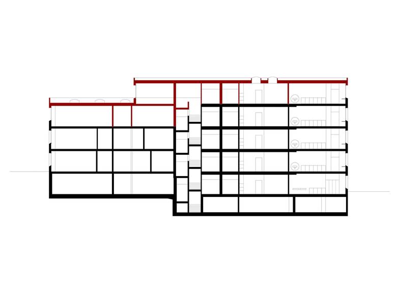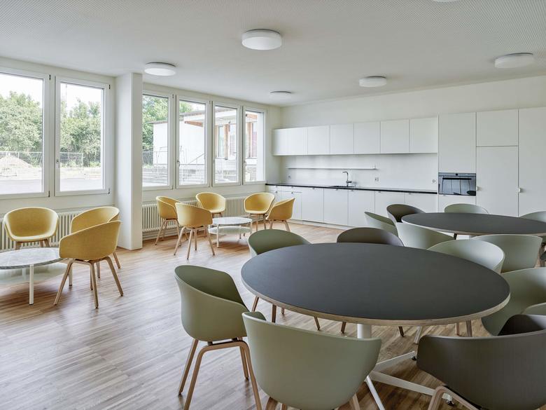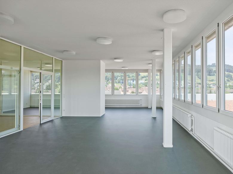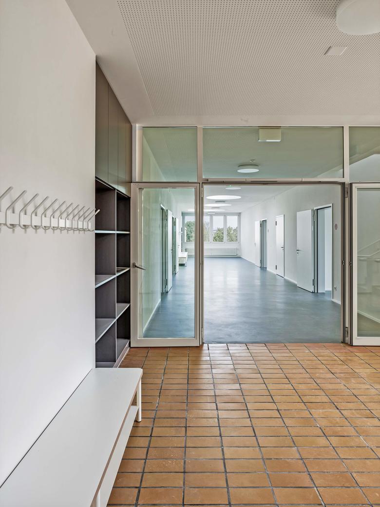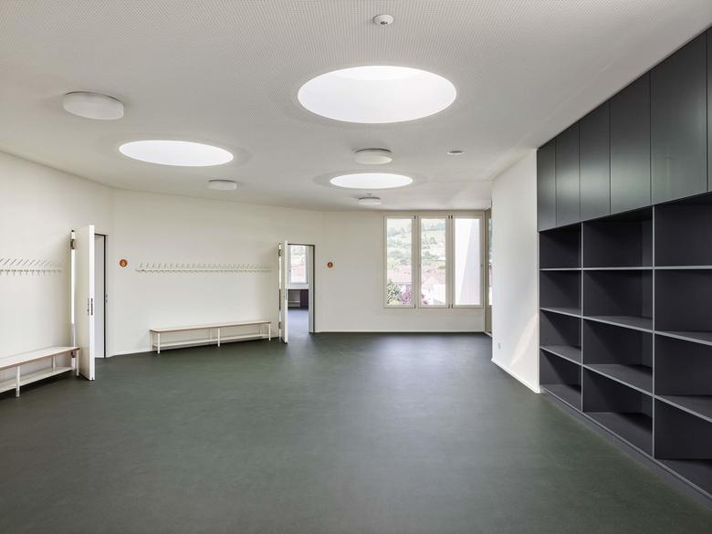 Der Ansatz des Weiterbauens ist auch im Innern konsequent fortgeführt. Die Aufstockung übernimmt die bestehende sternförmige Organisation der Unterrichtsräume. Neben dieser Erweiterung um sechs Klassenzimmer ist zusätzlich im Untergeschoss eine neue Tagesschule eingefügt worden. Die nötigen Anpassungen in der Fassade, um genügend Tageslicht zu erhalten, fügen sich dezent ein.