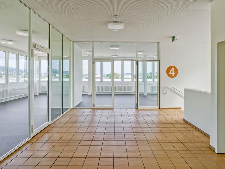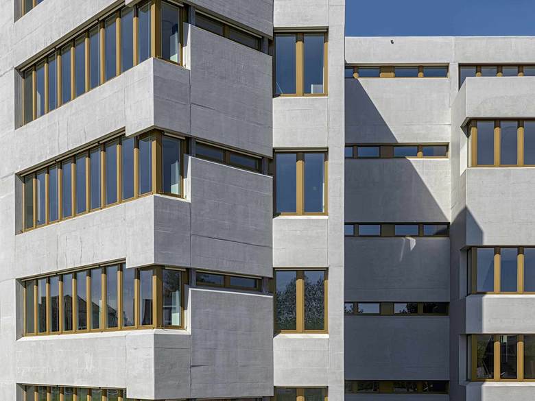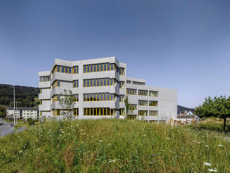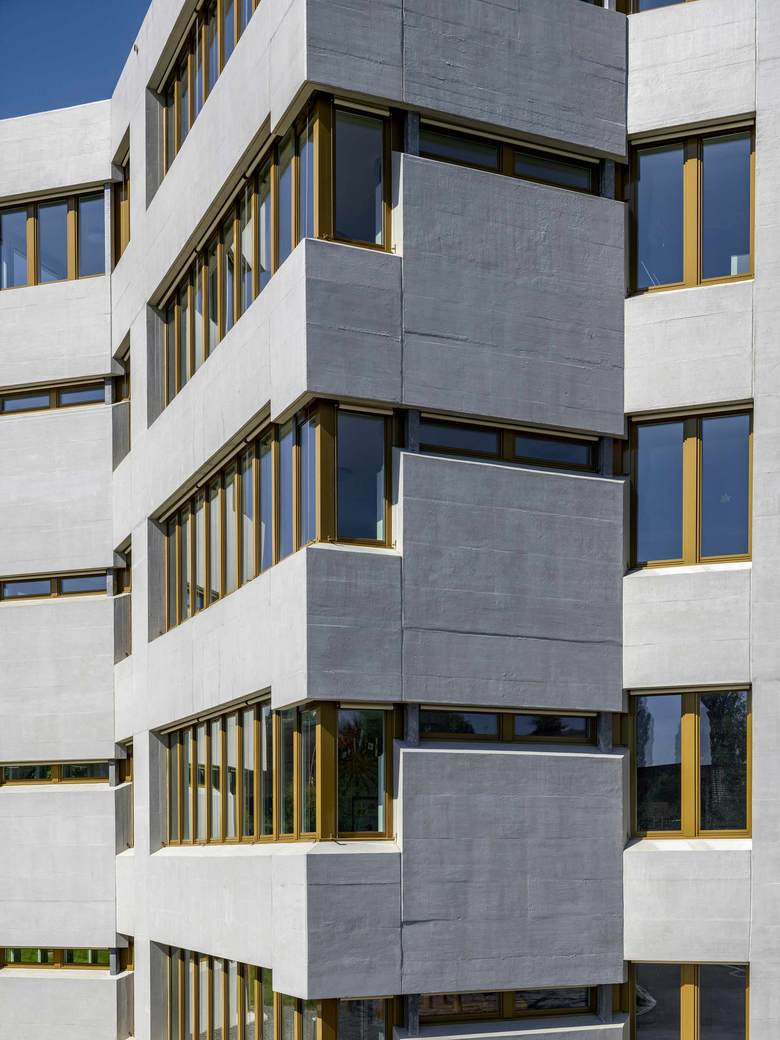 Als Antwort auf den grossen Mehrbedarf an Unterrichtsräumen wird der Altbau um ein Geschoss aufgestockt. Der konzeptionelle Ansatz des Weiterbauens ist sehr direkt umgesetzt. Die in Sichtbeton ausgeführte Aufstockung nimmt die bestehenden Fensterbänder und die Detaillierung sowie das Schalungsbild auf. Damit stehen die Neubauteile in engem Dialog mit dem Bestand und differenzieren sich über feine Nuancen erst auf den zweiten Blick.