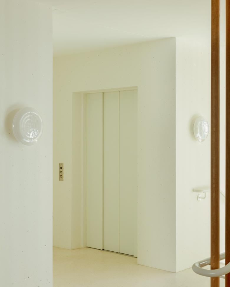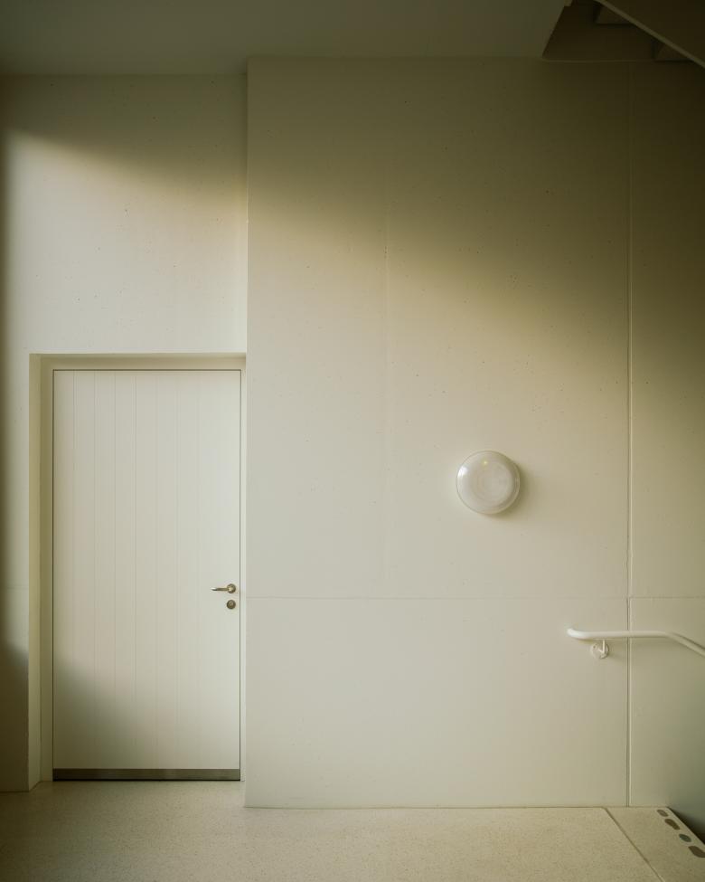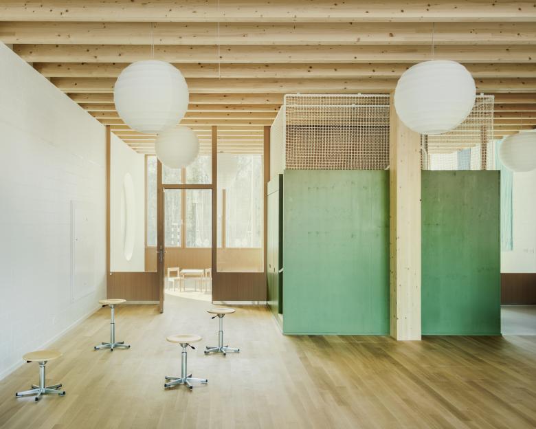 Clusterartige Raumorganisation – Das neue Schulhaus ist clusterartig organisiert. Auf beiden Geschossen sind jeweils fünf zweiseitig orientierte Unterrichtseinheiten untergebracht. Im Erdgeschoss befinden sich die Kindergärten und die Tagessschule mit direktem Aussenbezug. Die fünf Raumeinheiten sind über den aareseitigen Freiraum direkt von aussen zugänglich und intern über Türen verbunden. Das zentrale Treppenhaus erschliesst über den Haupteingang und den aareseitigen Korridor die Schulzimmer im Obergeschoss. Die Schul- und Reserveräume wenden sich bewusst zur ruhigen Pausenhofseite hin. Auch hier sind die Haupträume mit Türen direkt miteinander verbunden, was klassenübergreifende Unterrichtsformen ermöglicht.