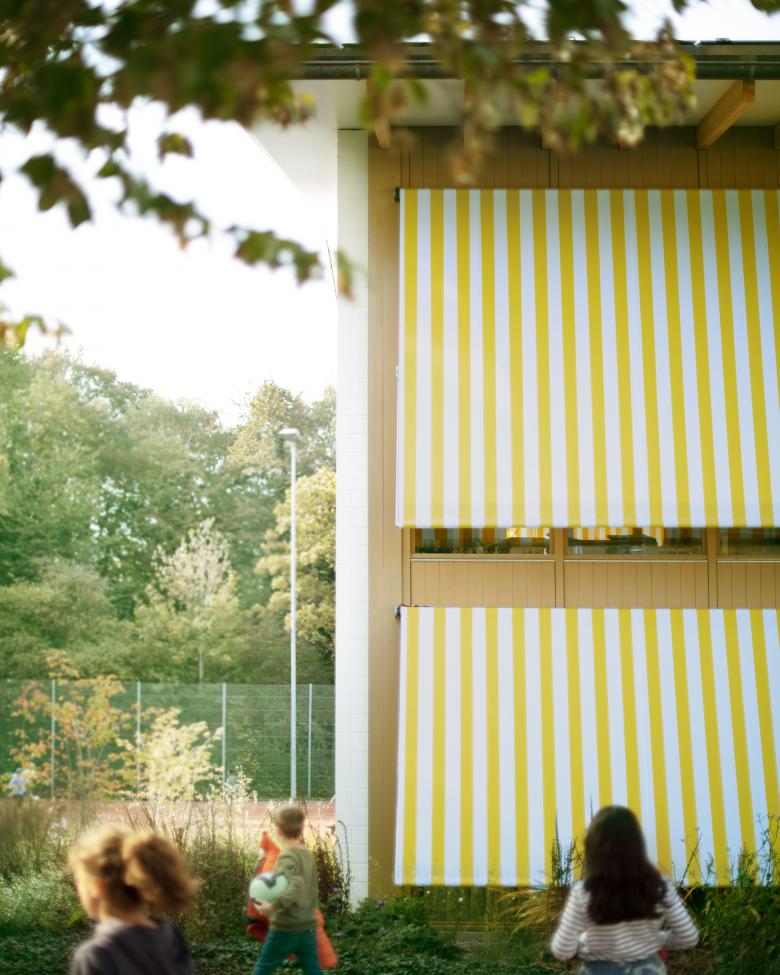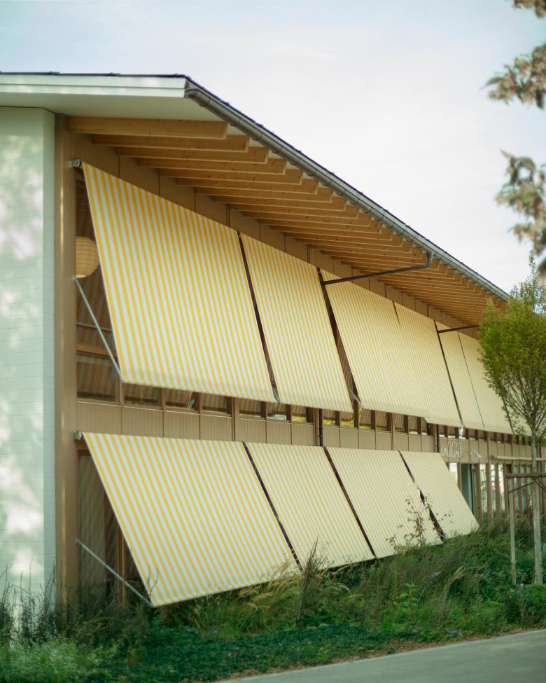 Das neue Schulhaus ist als feingliedriger schlichter Holzbau geplant. Die filigrane Bauweise und das Holz lassen den Baukörper klein erscheinen. Über die Materialität und die vertikale Gliederung verwebt sich der Baukörper mit den vegetativen Elementen des Grünraums und differenziert sich von den bestehenden Schulbauten. Die einzelnen Raumeinheiten sind ablesbar und prägen den Rhythmus der Fassaden. Der Neubau verhält sich leise und untergeordnet gegenüber den anderen Schulgebäuden.