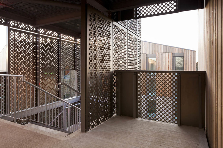 The aluminum cladding to the cores is perforated with a bespoke pattern designed in collaboration with Nicky Hirst, the visual artist that Hawkins\Brown previously worked with on the award-winning New Biochemistry department at the University of Oxford. The aluminum is anodised to a light bronze finish, which has been chosen to compliment the brick and timber finishes.