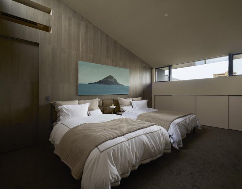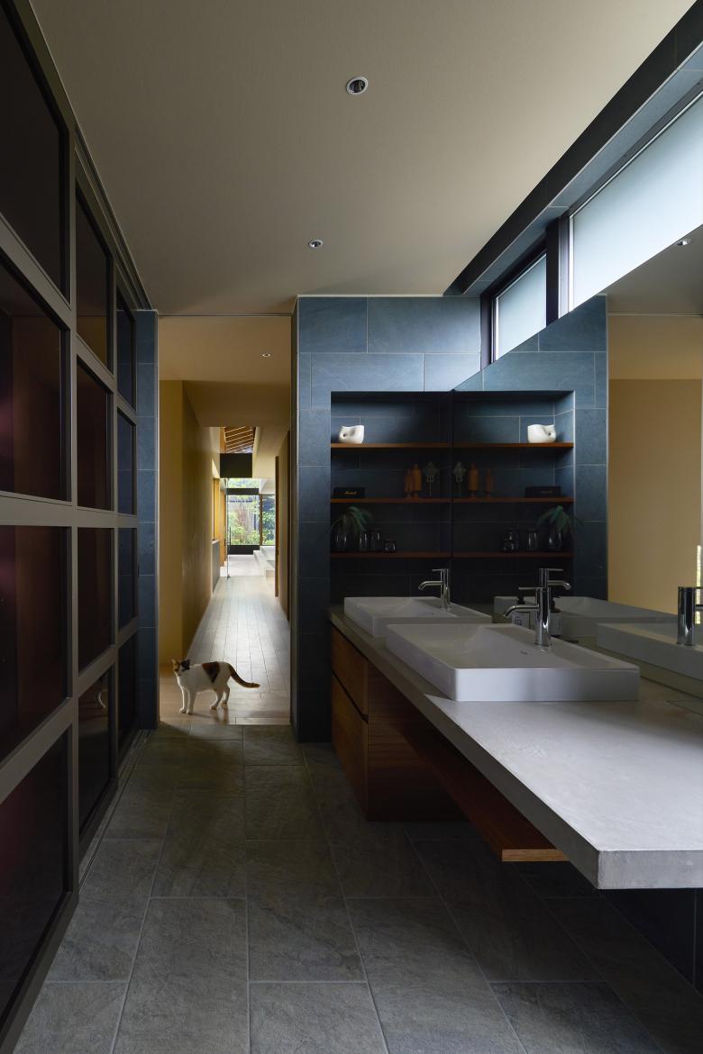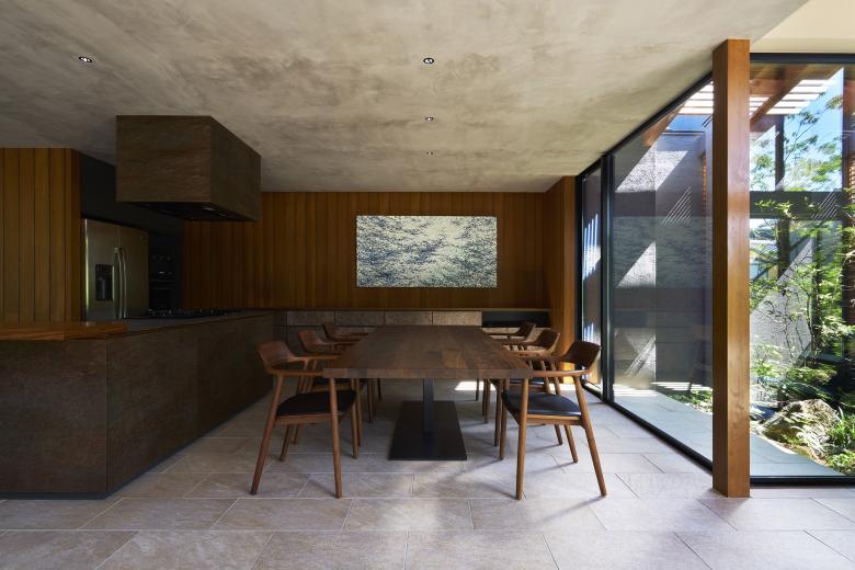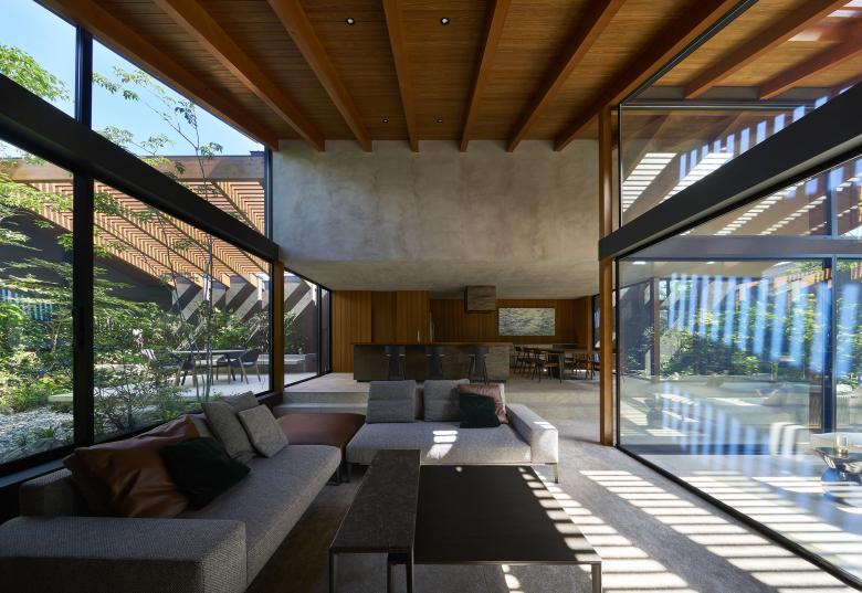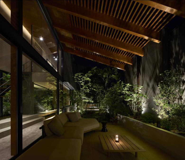 Each of the seven gardens is closely related to adjacent interior spaces and fulfills a distinct role depending on its location. The larger central courtyard and south garden accommodate an outdoor dining area and an outdoor living space, creating a gradational continuity between interior, intermediate, and exterior zones that lends depth to the overall spatial experience. Louvers softly filter views from the surroundings and mitigate direct sunlight, ensuring a comfortable outdoor environment.