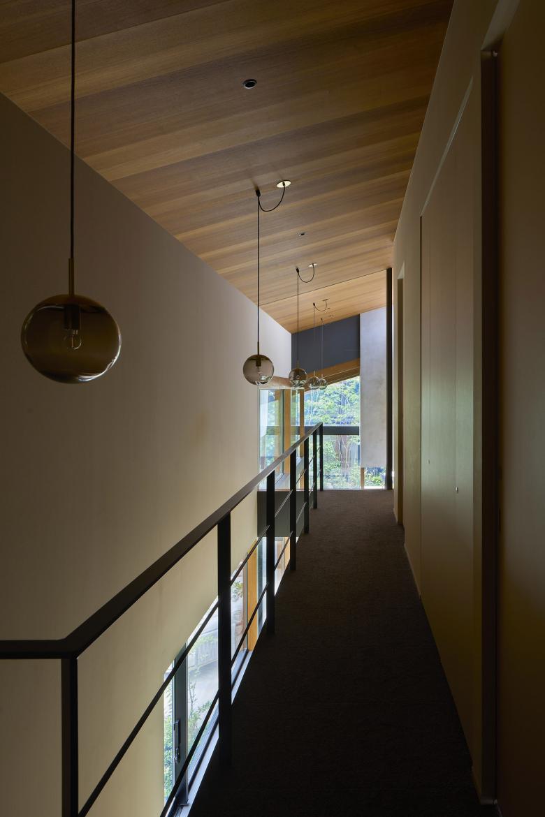 Circulation between rooms was planned with intentionally subdued brightness, creating a contrast with the gardens. The corridor leading from the entrance hall to the living room passes through a dimly lit space illuminated only by low windows, so that the light of the garden ahead is perceived with greater intensity. Similarly, the corridor leading to the study is designed with low windows, aiming for a quiet, cloister-like passage where natural light gently penetrates the darkness.
