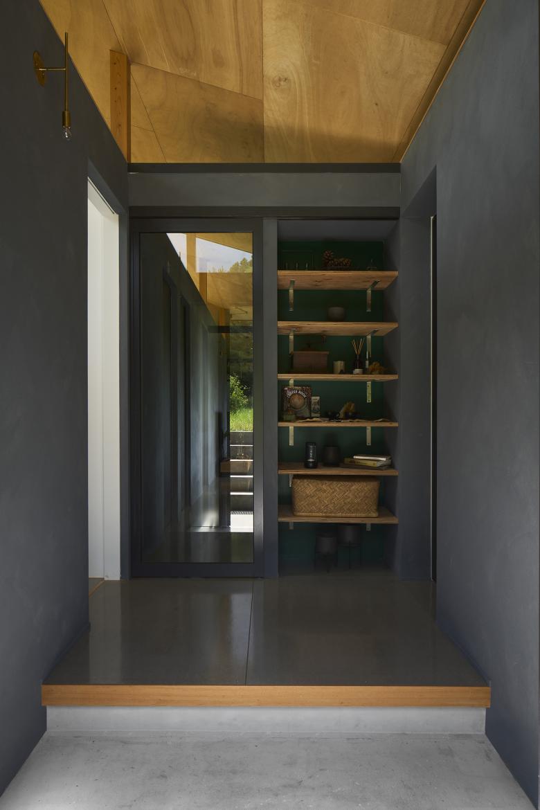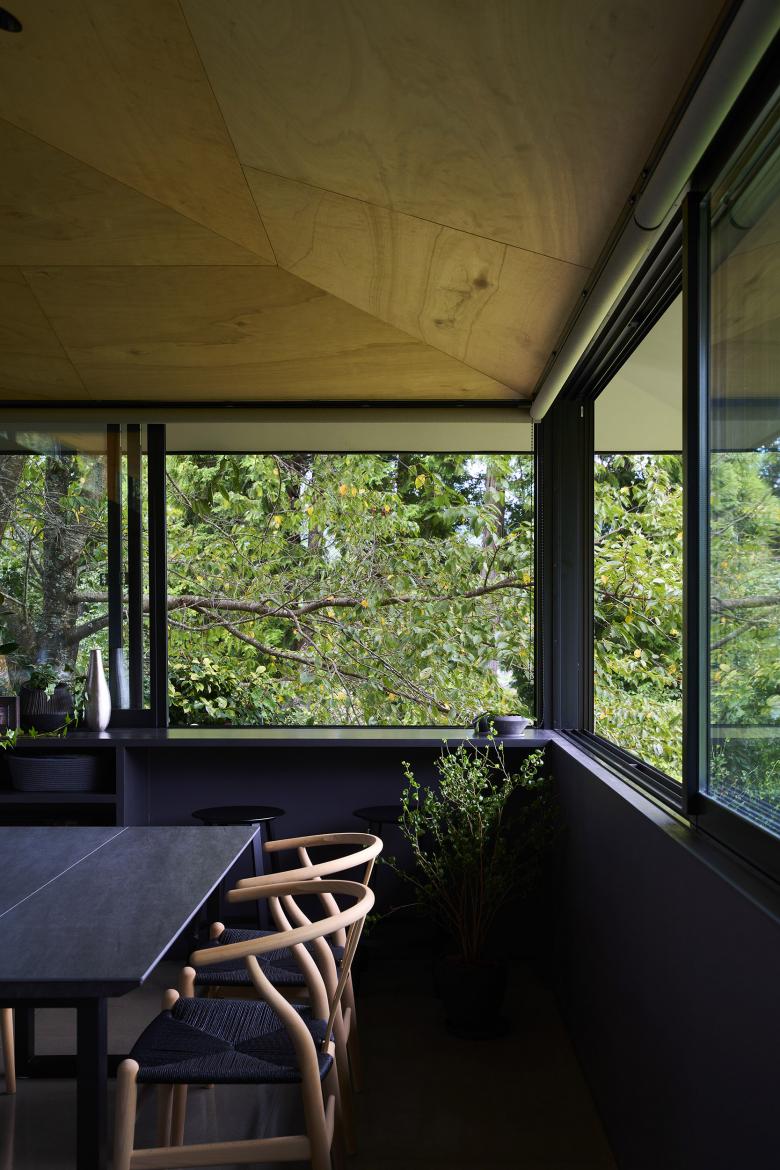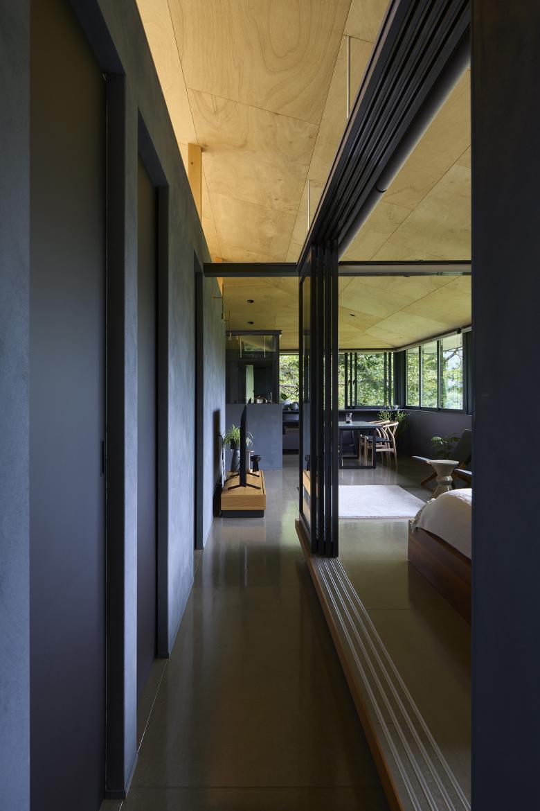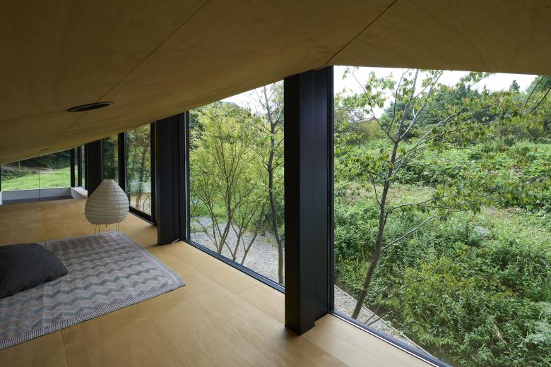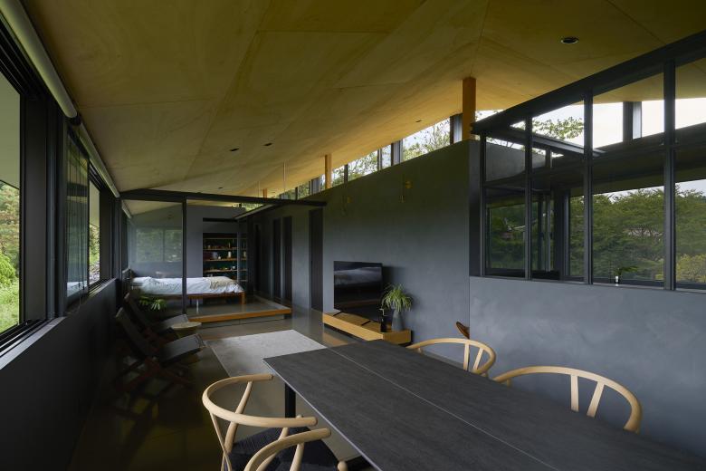 The building is a single-story residence for a couple, conceived as a continuous space containing a variety of places to inhabit. While areas are separated by glass, sightlines and light gently interweave, and variations in ceiling height and the placement of openings lend each zone its own character.