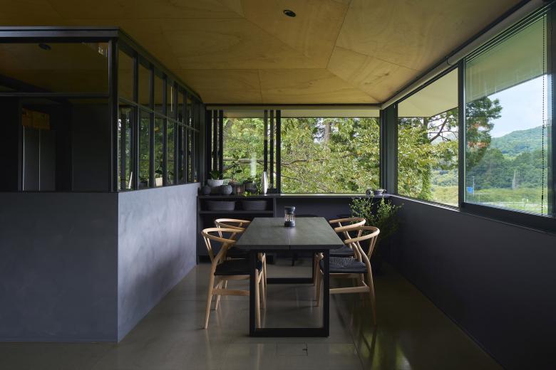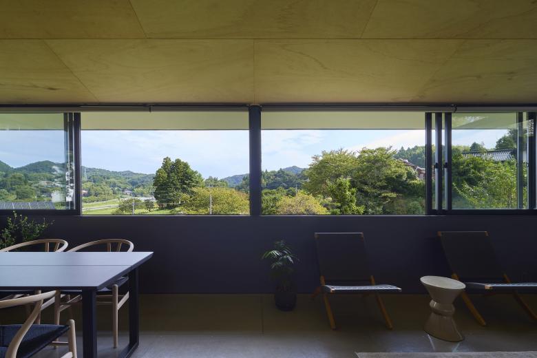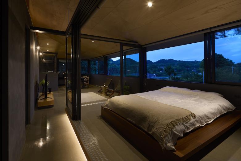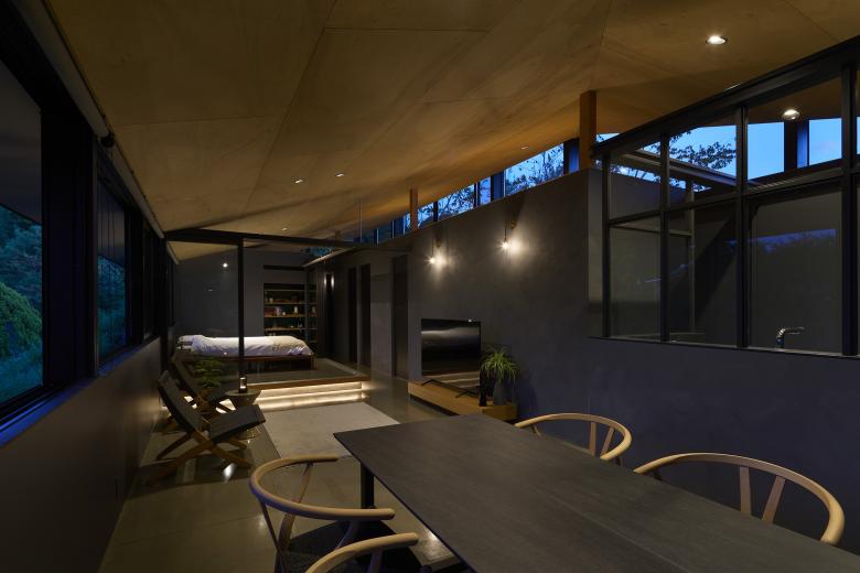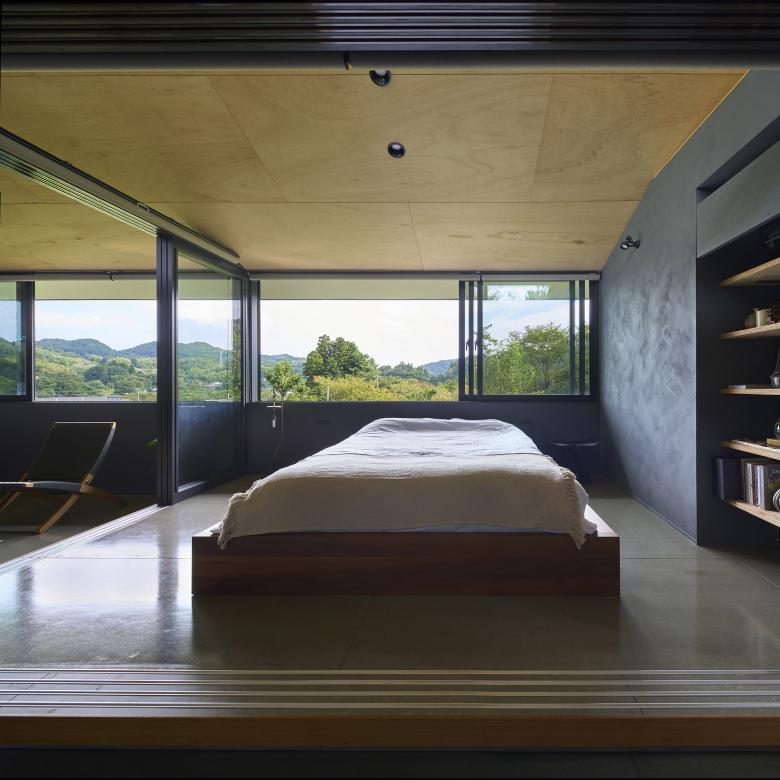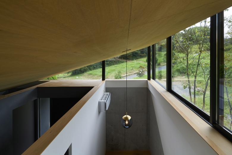 The LDK and bedroom are fitted with a series of connected windows that respond to the surrounding landscape. Low walls beneath the windows provide both openness and a calm sense of inwardness. In the loft, a large opening not only frames the view but also creates a place to spend time while gazing at the mountain ridges and the moon. These windows serve not only for daylight and views, but also as paths for airflow, allowing breezes that sweep across the hilltop to pass through the house.