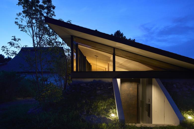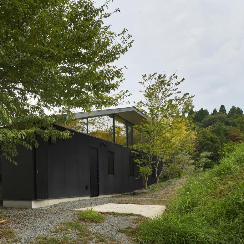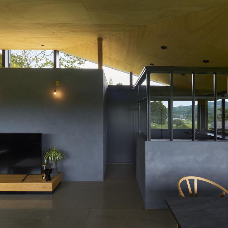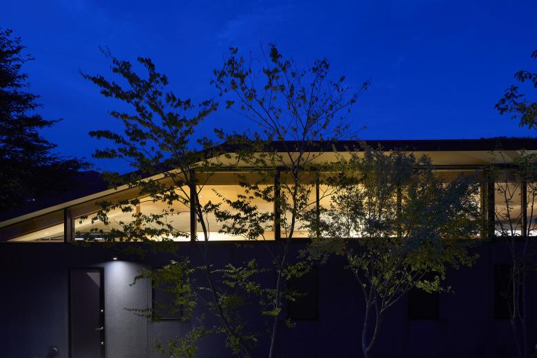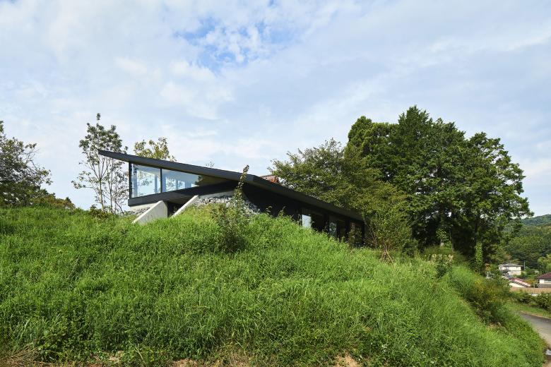 This house was planned in Ōda City, Shimane Prefecture, in a tranquil setting near the Iwami Ginzan Silver Mine, where gentle hills unfold amid a rural landscape. The site is shaped like a small hill, with its crest divided into two levels—an upper and a lower terrace. Rather than leveling this distinctive topography through earthwork, the design embraces the natural undulations of the hill, spanning them with a single, large roof.