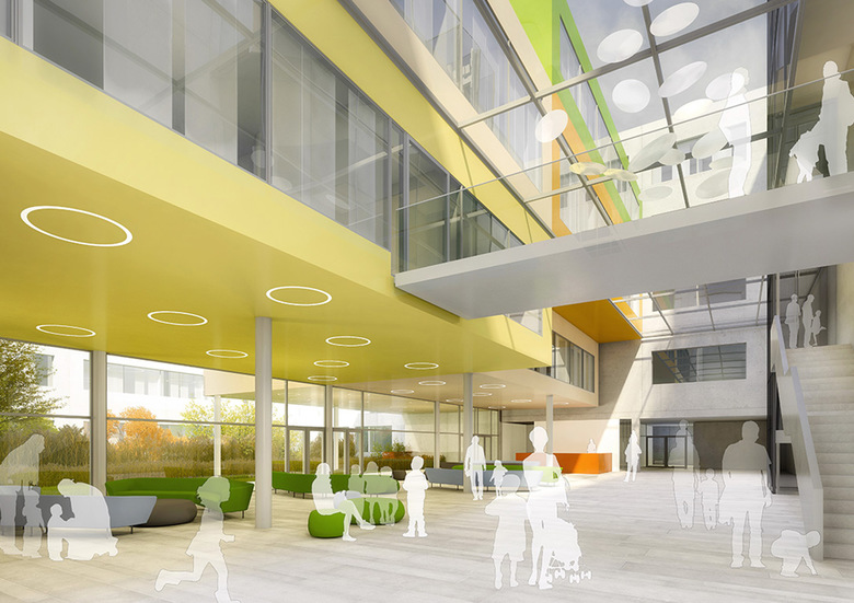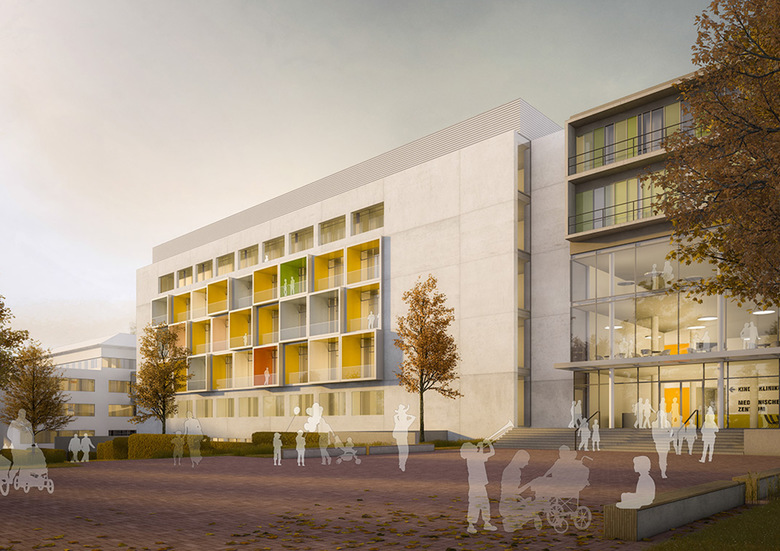 Der Entwurf basiert auf dem spielerischen Thema des „Baukastens“, das auf mehreren Ebenen und mit einem homogenen Farbkanon Anwendung findet. Die farbig gestalteten kastenförmigen Loggien bilden einen Sichtschutz für die Patienten bei gleichzeitig attraktiven Ausblicken. Die Kastenstruktur wird in der Querspange fortgesetzt, die sich aus locker gestapelten, gegeneinander versetzten Kuben formt.